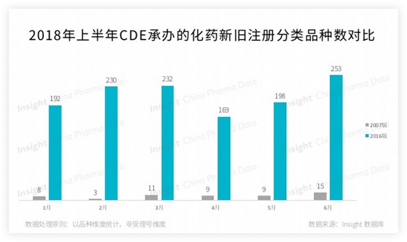 今年上半年承辦 1329 個(gè)化藥品種,其中有 1274 個(gè)按照 2016 年新版注冊(cè)分類申報(bào),另外有 55 個(gè)按照舊版 2007 版注冊(cè)分類申報(bào),后者多為 2014 年 CFDA 受理的品種。