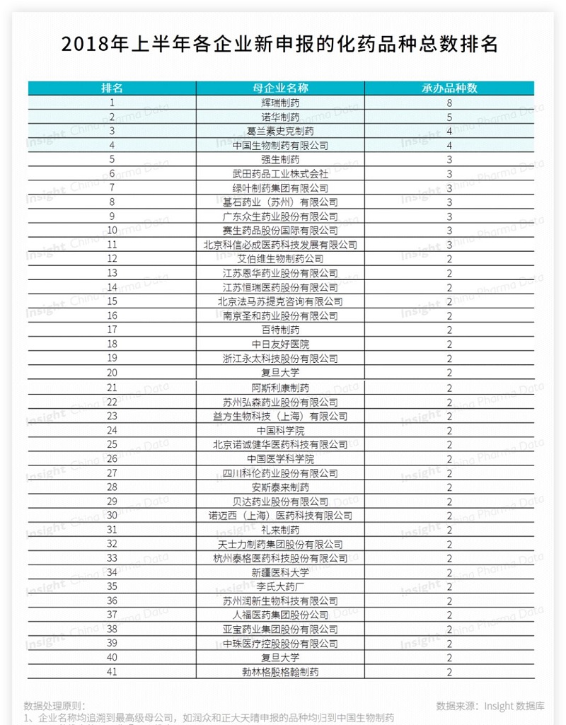 上半年申報(bào)品種數(shù)量企業(yè)排名中,輝瑞拔得頭籌,而 2017 年排名第一的諾華今年排名第二。