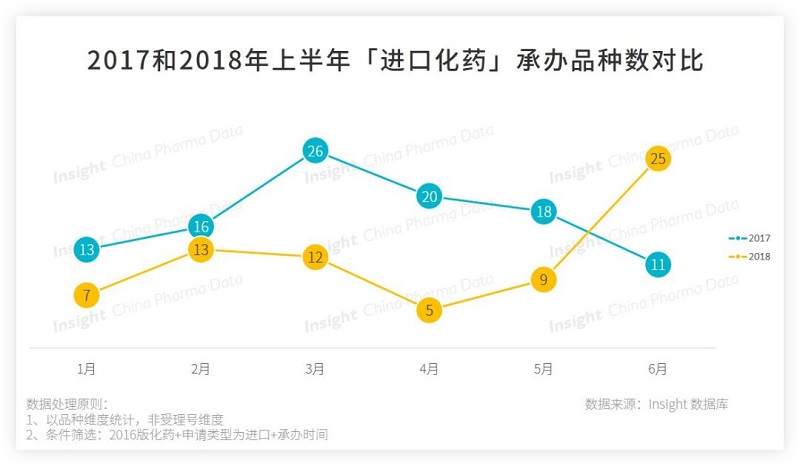 今年上半年進(jìn)口藥申報(bào)品種數(shù)量為 71 個(gè),在 5 月,2018 年上半年進(jìn)口化藥承辦數(shù)量前均低于 2017 年同期,2018 年 6 月藥品申報(bào)出現(xiàn)了一個(gè)小高峰,該月進(jìn)口化藥申報(bào)品種數(shù)量為 25 個(gè),這可能與今年陸續(xù)出臺(tái)的調(diào)整進(jìn)口藥品注冊(cè)管理有關(guān)事項(xiàng)的決定有關(guān),在政策上是鼓勵(lì)進(jìn)口藥申報(bào)的。