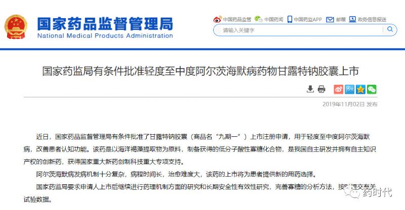 近日,國(guó)家藥品監(jiān)督管理局有條件批準(zhǔn)了甘露特鈉膠囊(商品名“九期一”)上市注冊(cè)申請(qǐng),用于輕度至中度阿爾茨海默病,改善患者認(rèn)知功能。該藥是以海洋褐藻提取物為原料,制備獲得的低分子酸性寡糖化合物,是我國(guó)自主研發(fā)并擁有自主知識(shí)產(chǎn)權(quán)的創(chuàng)新藥,獲得國(guó)家重大新藥創(chuàng)制科技重大專項(xiàng)支持。