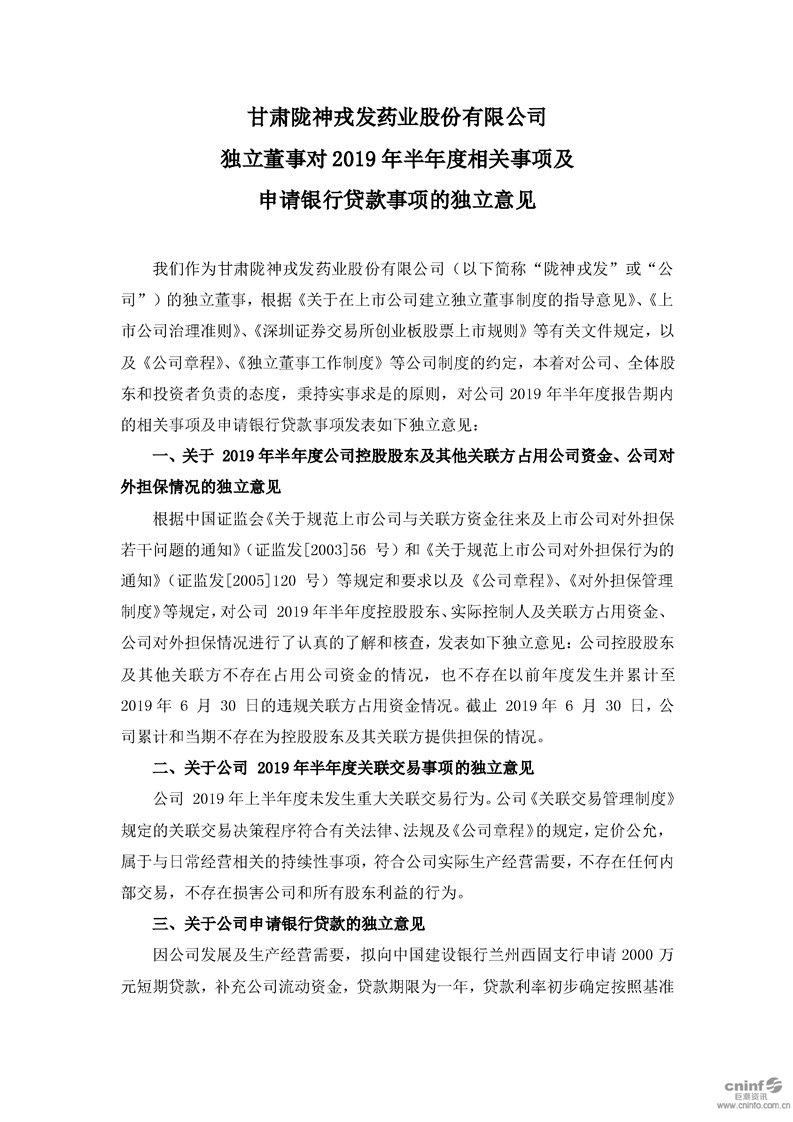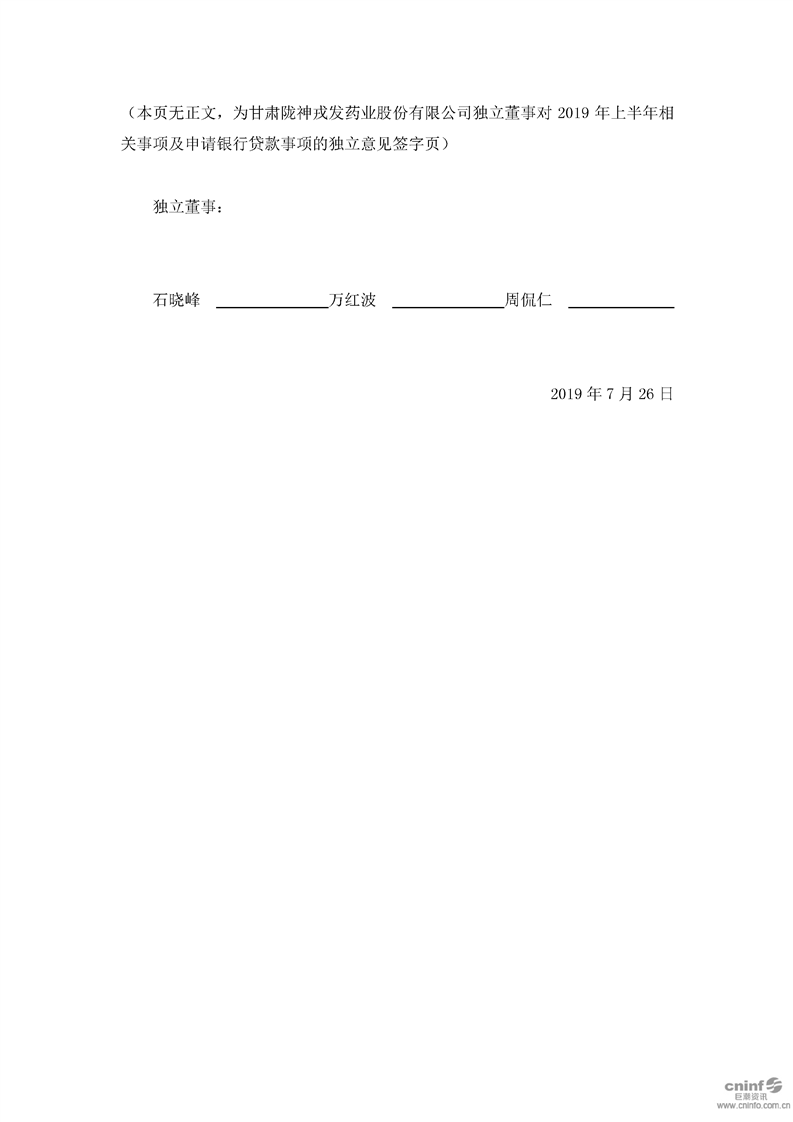 獨立董事對2019年半年度相關(guān)事項及申請銀行貸款事項的獨立意見