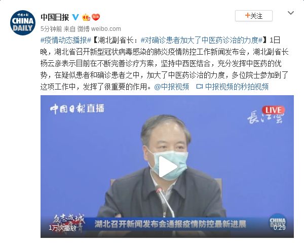 2月1日,湖北副省長楊云彥表示目前在不斷完善診療方案,堅(jiān)持中西醫(yī)結(jié)合,充分發(fā)揮中醫(yī)藥的優(yōu)勢,在疑似患者和確診患者之中,加大了中醫(yī)藥診治的力度,多位院士參加到了這項(xiàng)工作中,發(fā)揮了很重要的作用。