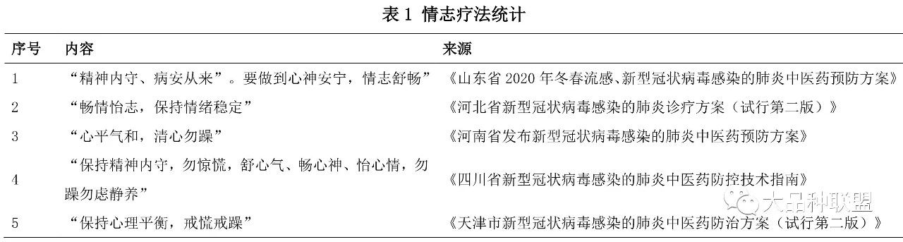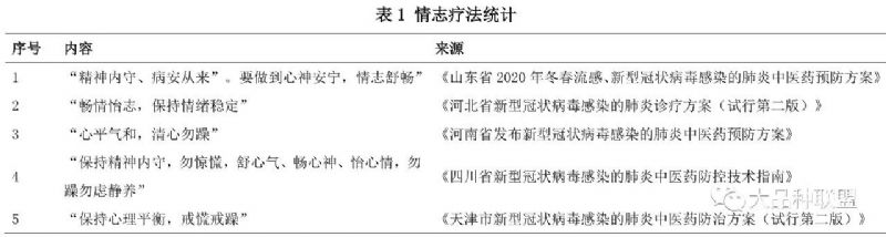 情志療法是中醫(yī)臨床上重要的療法之一。在新冠肺炎預(yù)防中,很多省份發(fā)布的中醫(yī)藥防治方案中都有提及情志療法,如2020年1月27日山東省衛(wèi)健委發(fā)布的《山東省2020年冬春流感、新型冠狀病毒感染的肺炎中醫(yī)藥預(yù)防方案》之“‘精神內(nèi)守、病安從來’。要做到心神安寧,情志舒暢”的闡述;2020年1月30日河北省發(fā)布的《新型冠狀病毒感染的肺炎診療方案(試行第二版)》之“暢情怡志,保持情緒穩(wěn)定”的描述;2020年1月27日河南省《河南省發(fā)布新型冠狀病毒感染的肺炎中醫(yī)藥預(yù)防方案》之“心平氣和,清心勿躁”的強(qiáng)調(diào)等等。具體見下表1。