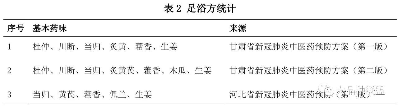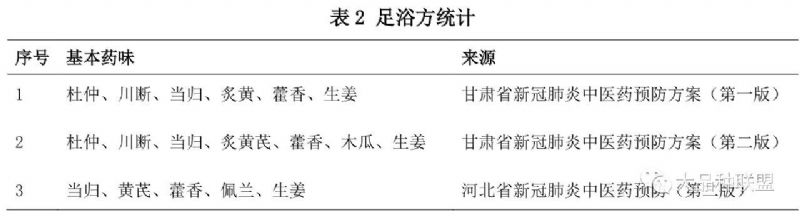 足浴也是中醫(yī)藥養(yǎng)生保健的重要內(nèi)容,通過添加適當(dāng)適量的中藥,可達(dá)到扶正祛邪,增強(qiáng)體質(zhì)的作用。通過統(tǒng)計(jì),發(fā)現(xiàn)有3個(gè)足浴方。其中藿香、生姜、黃芪、當(dāng)歸應(yīng)用較多。見表2。