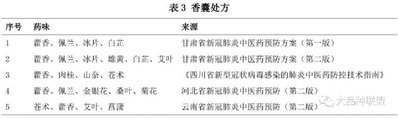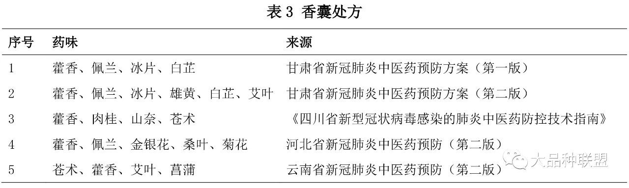 香薰即為香囊、藥物熏,是空氣消毒的有效方法之一。其香囊根據(jù)“芳香辟穢”“芳香化濁”等原理,具有驅(qū)蟲、凈化空氣等作用;藥物熏主要有煮水熏和點(diǎn)燃熏,如《四川省新型冠狀病毒感染的肺炎中醫(yī)藥防控技術(shù)指南》就發(fā)布了一個(gè)煮水熏的方子,原文為:熏蒸處方:板藍(lán)根10g、石菖蒲10g、貫眾10g、金銀花15g,加水1000ml,泡10分鐘,小火慢煮30分鐘,濃縮藥液150ml。使用時(shí)在室內(nèi)進(jìn)行,將熏蒸方藥液加入洗凈的家用空氣加濕器中通電熏蒸或者在鍋中持續(xù)蒸煮揮發(fā),每天1-2次;點(diǎn)燃熏在民間較普遍,如艾熏、蒼術(shù)熏等。為安全起見,香囊最為保險(xiǎn)。此次,也有香囊方的推薦,主要藥物為藿香、佩蘭、白芷、艾葉等。具體見表3。