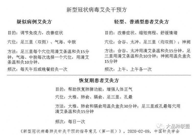 艾灸和穴位按摩在日常的生活中常見,被大多數(shù)人熟悉。其同樣能達(dá)到預(yù)防、治療疾病的作用。 2020年2月9日中國針灸學(xué)會(huì)發(fā)布了《新型冠狀病毒肺炎針灸干預(yù)指導(dǎo)意見(第一版)》,對疑似病例,輕型、普通型患者,恢復(fù)期患者分別給予了艾灸干預(yù)方。見圖1。