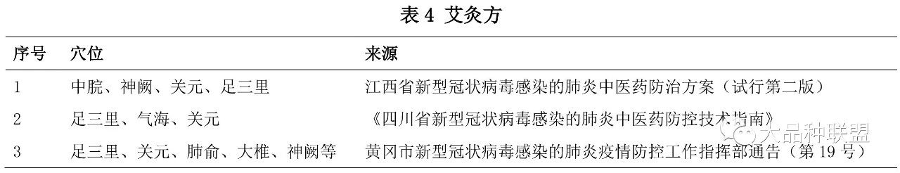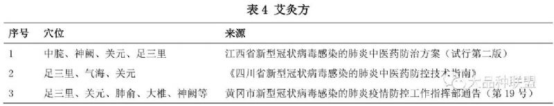 同樣,部分省中醫(yī)藥預(yù)防方案中也有艾灸的提及,大多數(shù)穴位為中脘、神闕、關(guān)元、足三里,均為健脾祛濕、顧護(hù)脾胃的穴位,簡單易操作。見表4。