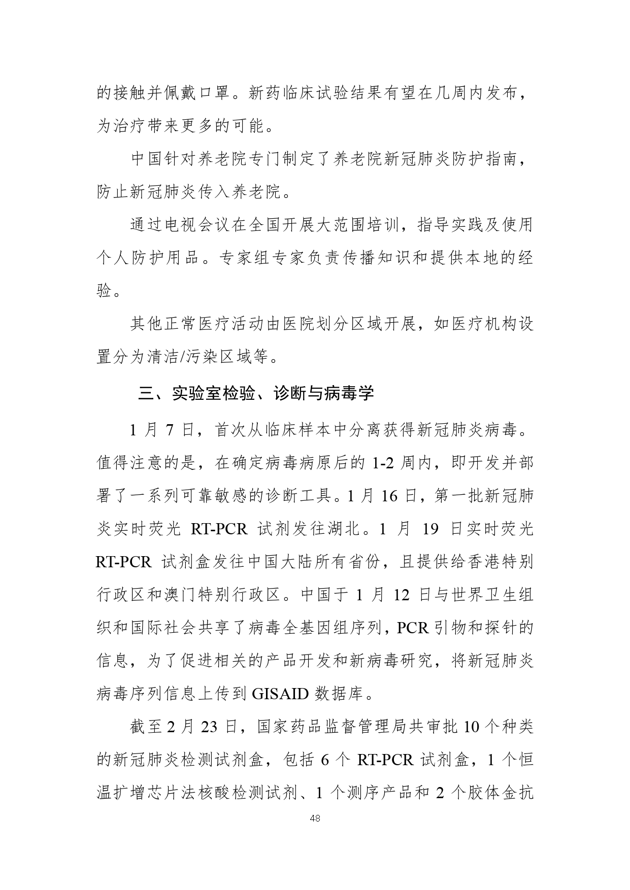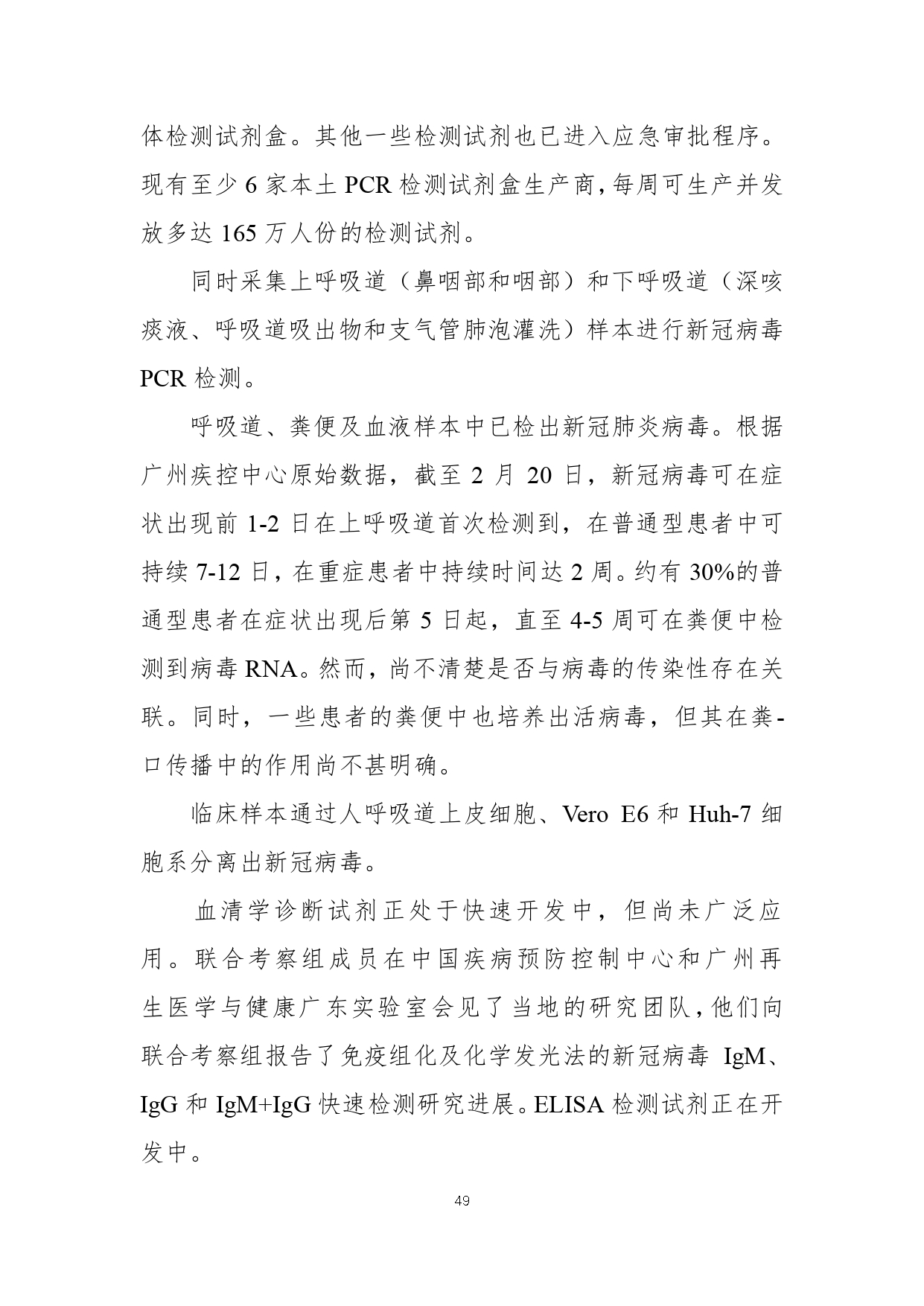 2月29日,國(guó)家疾病預(yù)防控制局發(fā)布《中國(guó)-世界衛(wèi)生組織新型冠狀病毒肺炎(COVID-19)聯(lián)合考察報(bào)告》,對(duì)重視問(wèn)題、主要發(fā)現(xiàn)、中國(guó)和全球應(yīng)對(duì)措施及下一步工作進(jìn)行了闡述,并且公布了部分實(shí)驗(yàn)室檢驗(yàn)、診斷與病毒學(xué)、研發(fā)等方面詳細(xì)的技術(shù)調(diào)查結(jié)果。