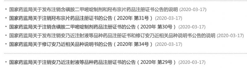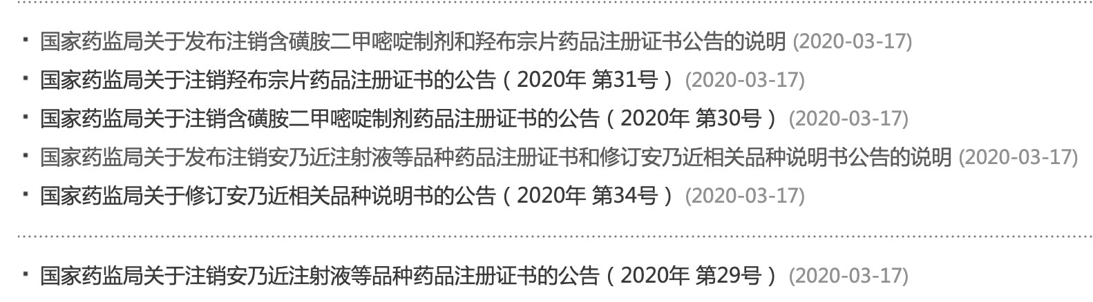2020年03月17日國(guó)家藥品監(jiān)督管理局(NMPA)連續(xù)發(fā)布了6個(gè)關(guān)于安乃近注射液、含磺胺二甲嘧啶制劑、羥布宗片等品種注銷(xiāo)公告。