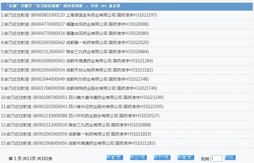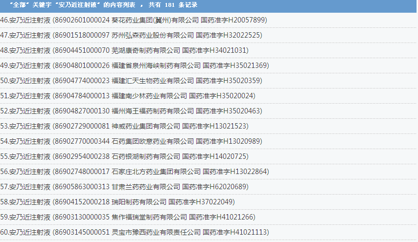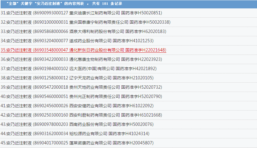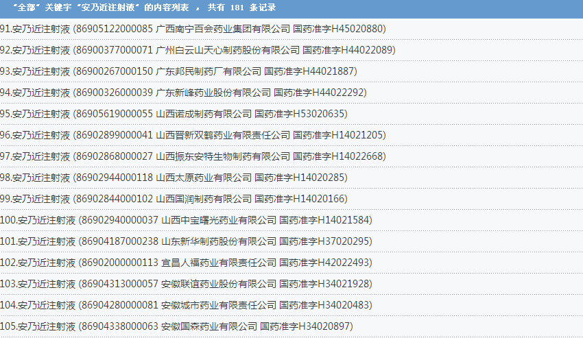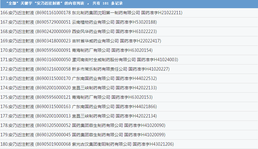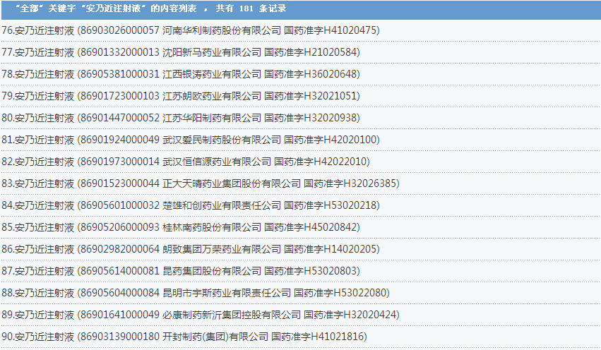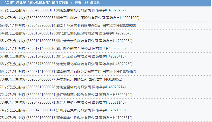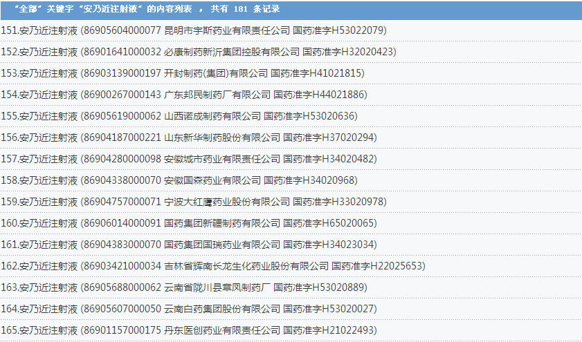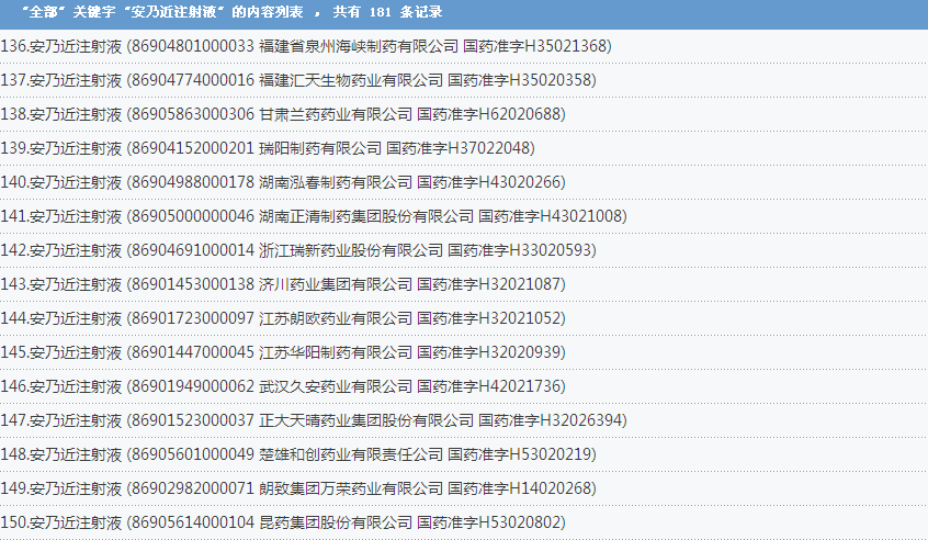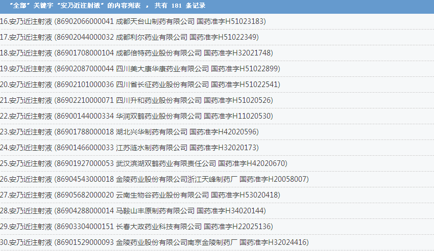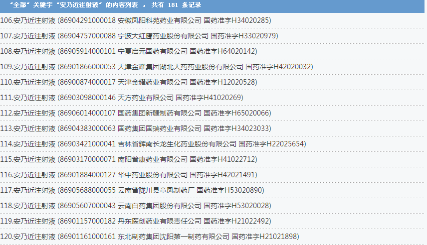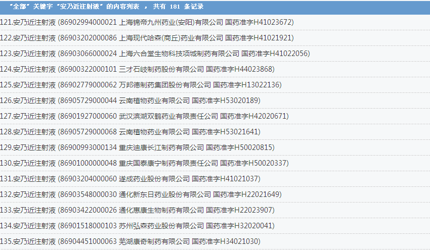 安乃近注射液:國(guó)內(nèi)共有181個(gè)批準(zhǔn)文號(hào),涉及了上海信誼金朱藥業(yè)有限公司、福建古田藥業(yè)有限公司、成都第一制藥有限公司等企業(yè):