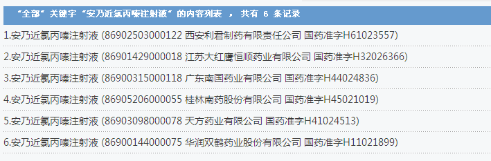 安乃近氯丙嗪注射液:6個(gè)批準(zhǔn)文號(hào)