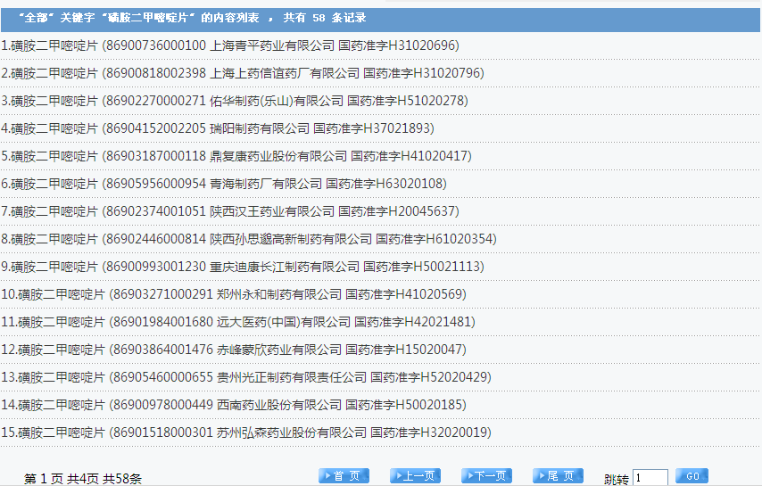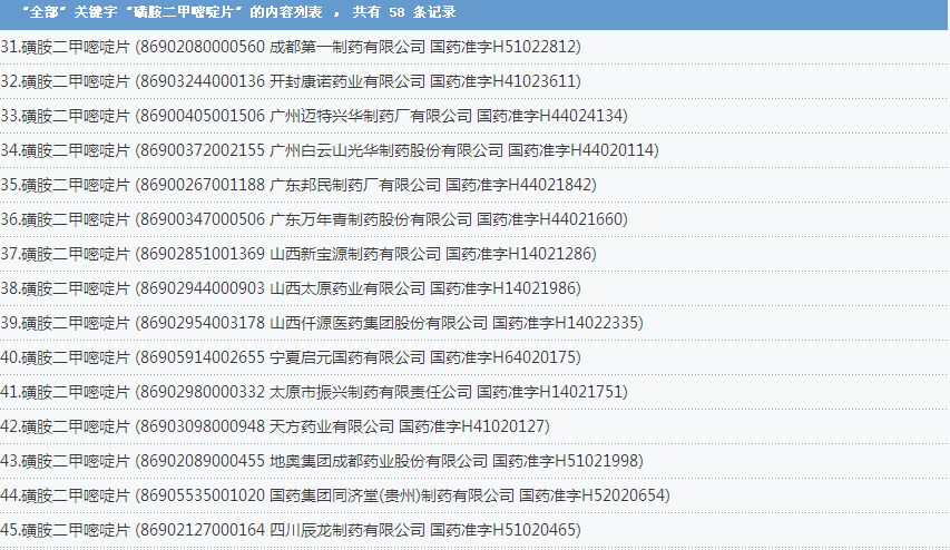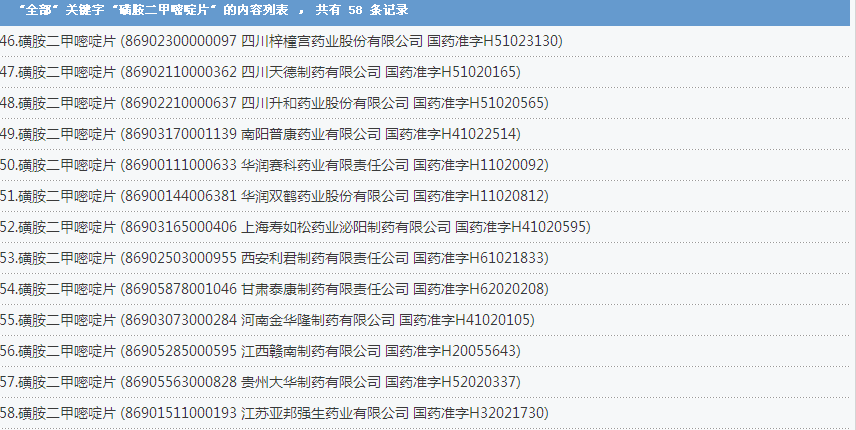 磺胺二甲嘧啶片:58個(gè)批準(zhǔn)文號(hào)
