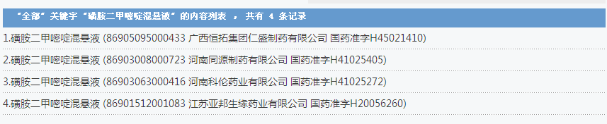 磺胺二甲嘧啶混懸液:4個(gè)批準(zhǔn)文號(hào)