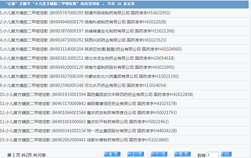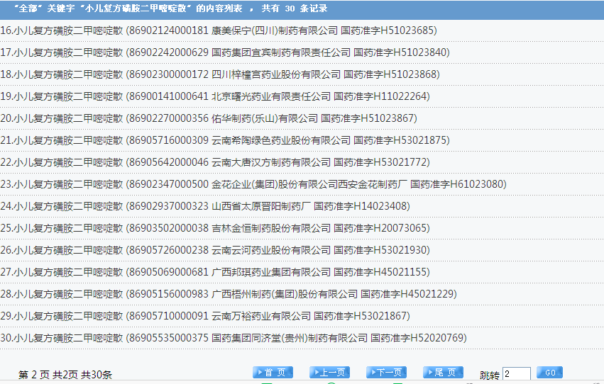 小兒復(fù)方磺胺二甲嘧啶散:30個(gè)批準(zhǔn)文號(hào):