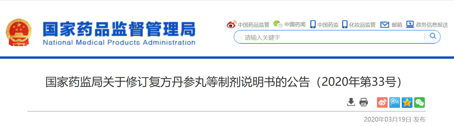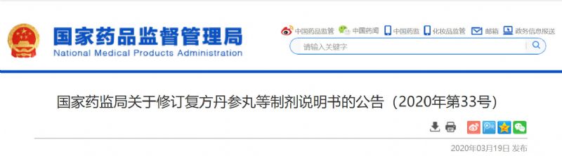 3月19日,國家藥品監(jiān)督管理局對復(fù)方丹參丸,包括復(fù)方丹參丸、復(fù)方丹參片、復(fù)方丹參膠囊、復(fù)方丹參軟膠囊、復(fù)方丹參腸溶膠囊、復(fù)方丹參噴霧劑(復(fù)方丹參氣霧劑)、復(fù)方丹參顆粒、復(fù)方丹參滴丸、復(fù)方丹參口服液等制劑,冠心蘇合丸等制劑11個品種說明書進(jìn)行統(tǒng)一修訂。