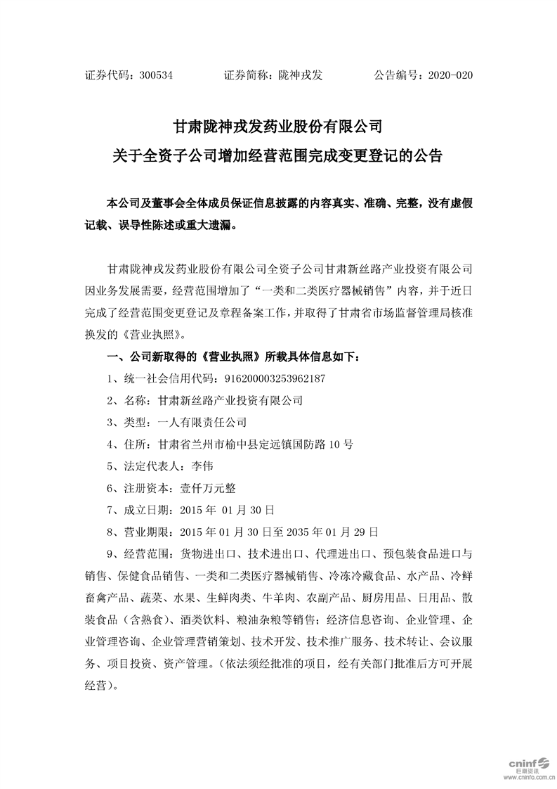 關(guān)于全資子公司增加經(jīng)營范圍完成變更登記的公告