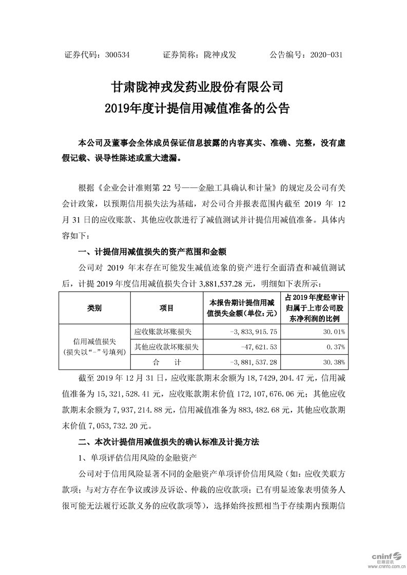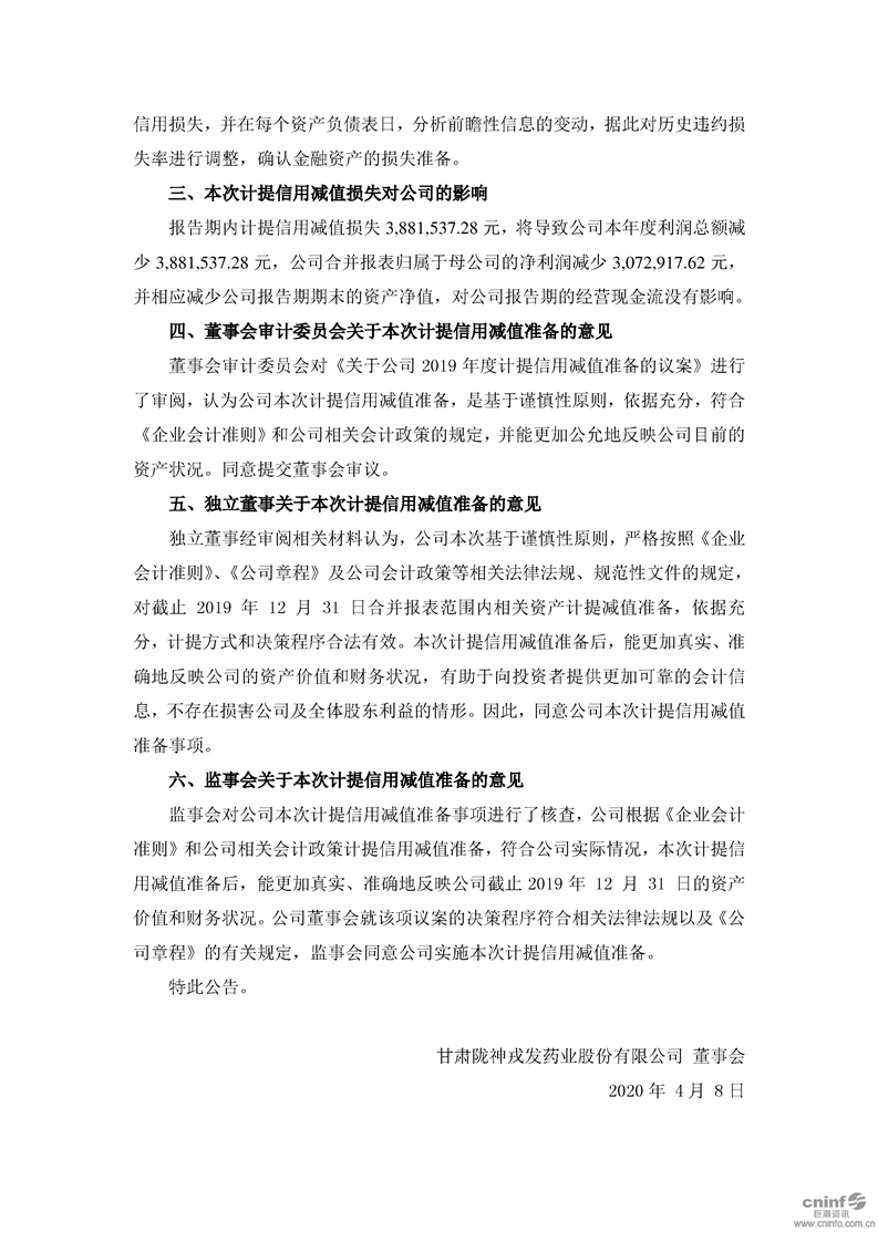 2019年度計(jì)提信用減值準(zhǔn)備的公告