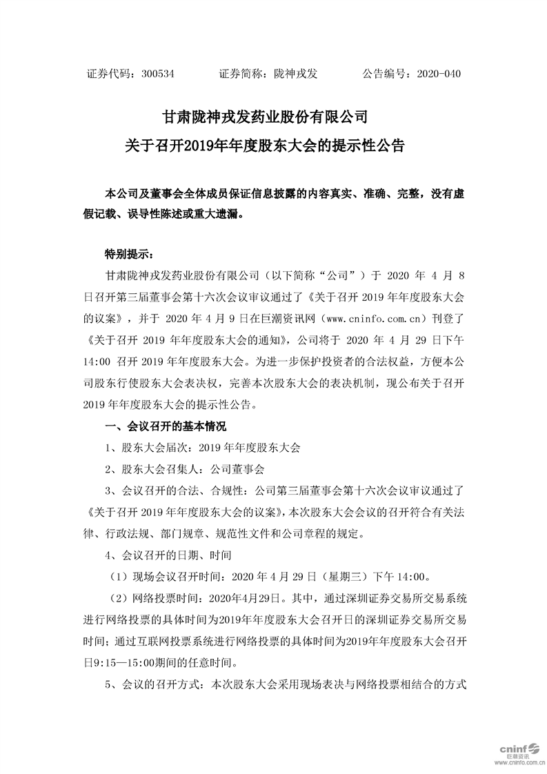 關(guān)于召開2019年年度股東大會(huì)的提示性公告