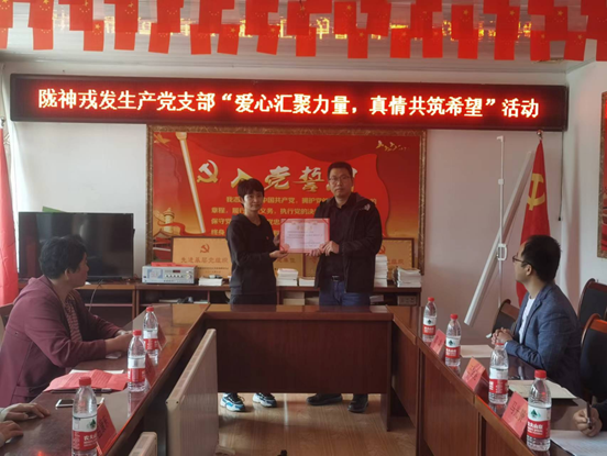 代表生產(chǎn)第一黨支部和生產(chǎn)第二黨支部為杜強(qiáng)愛人捐贈善款