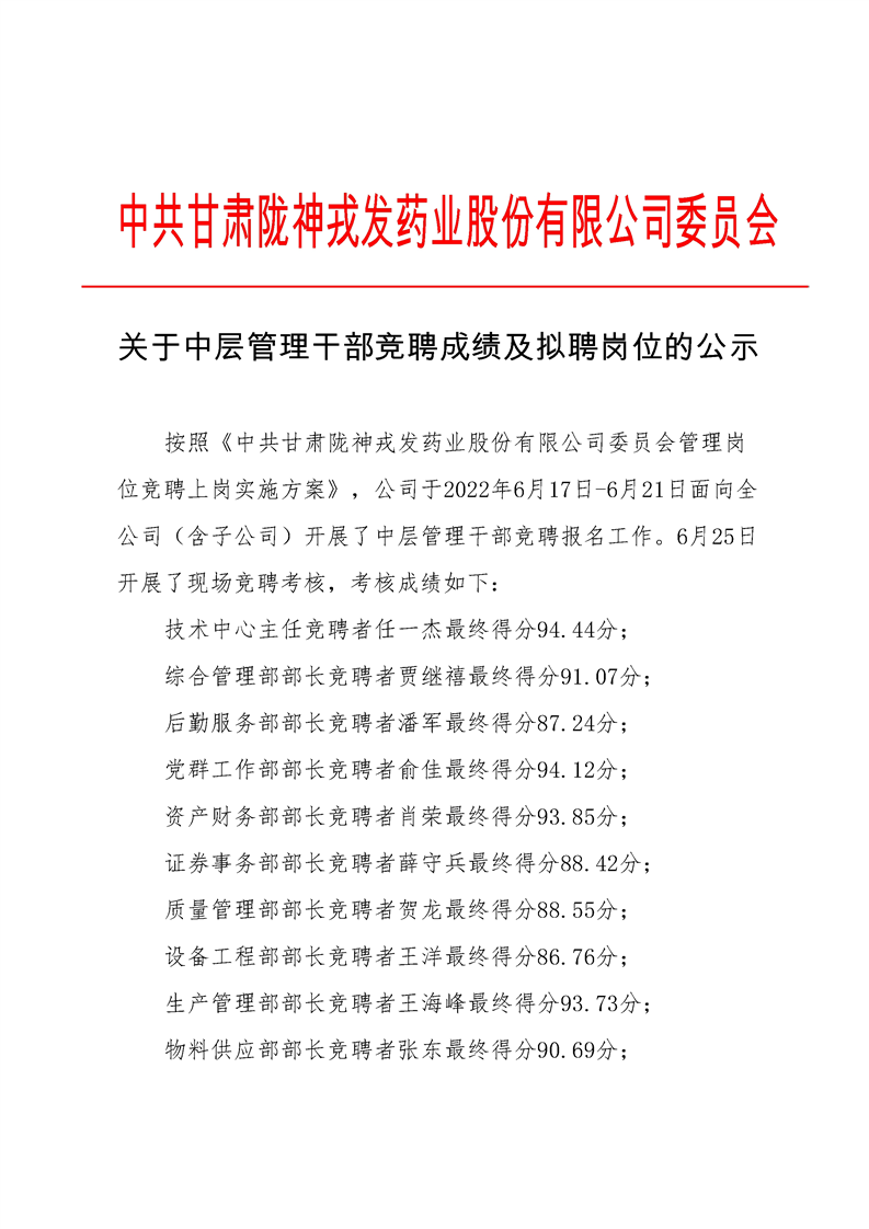 關(guān)于中層管理干部競(jìng)聘成績(jī)及擬聘崗位的公示