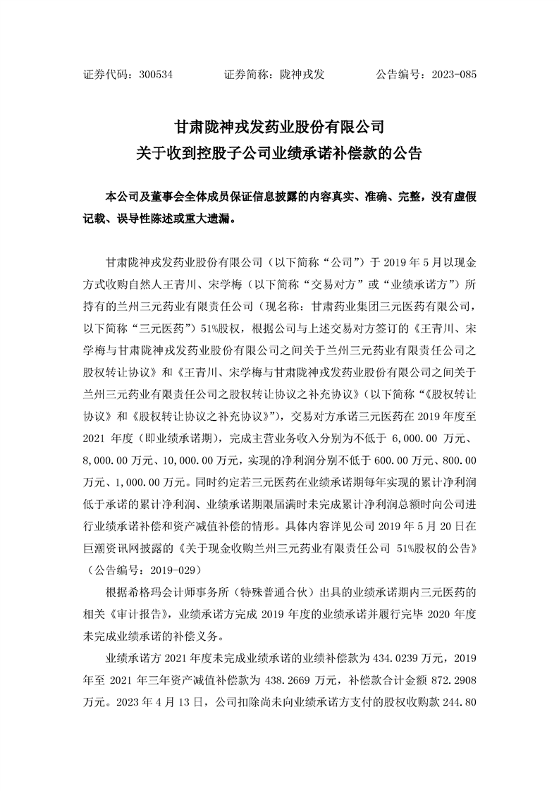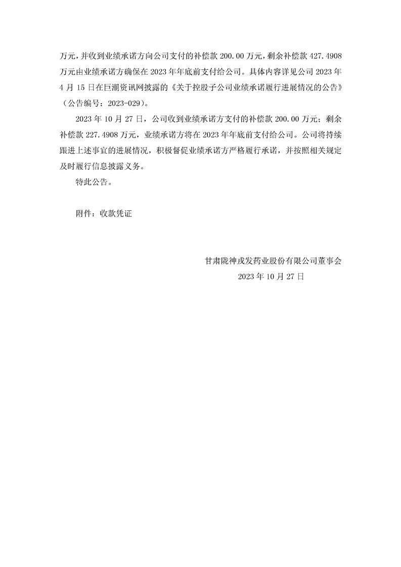 關(guān)于收到控股子公司業(yè)績承諾補(bǔ)償款的公告