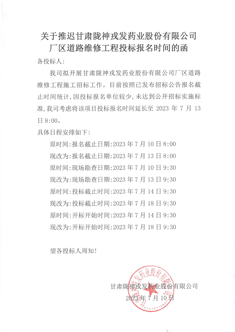 甘肅隴神戎發(fā)藥業(yè)股份有限公司廠(chǎng)區(qū)道路維修工程招標(biāo)公告