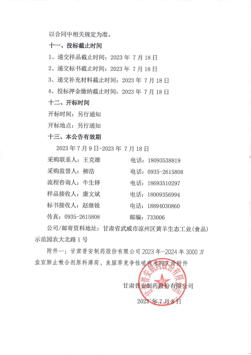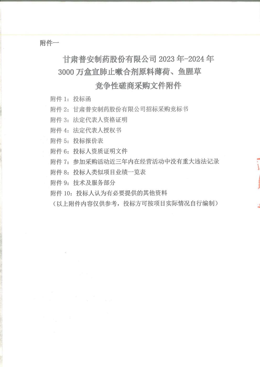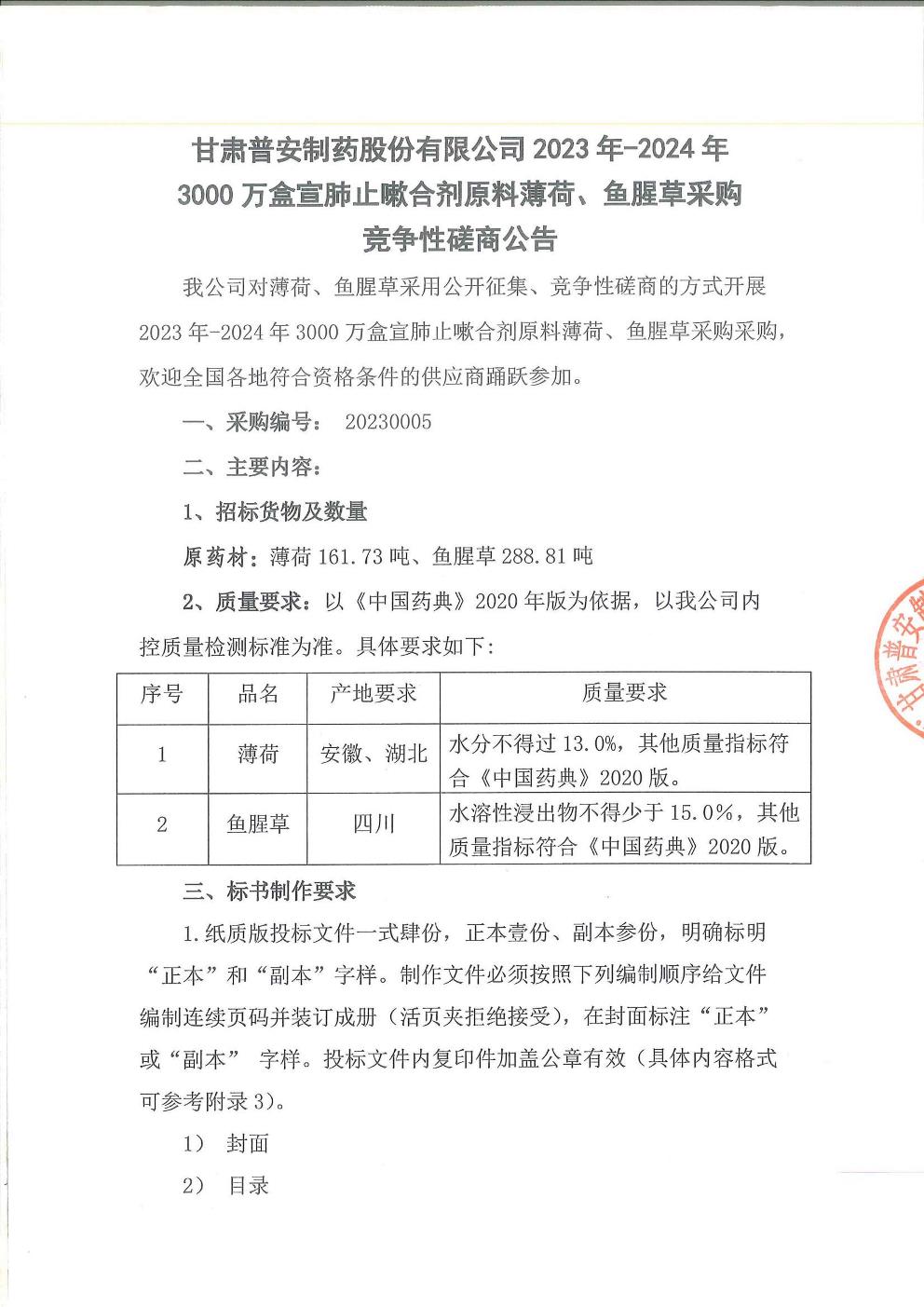 甘肅普安制藥股份有限公司 2023 年-2024年3000 萬盒宣肺止嗽合劑原料薄荷、魚腥草采購競爭性磋商公告