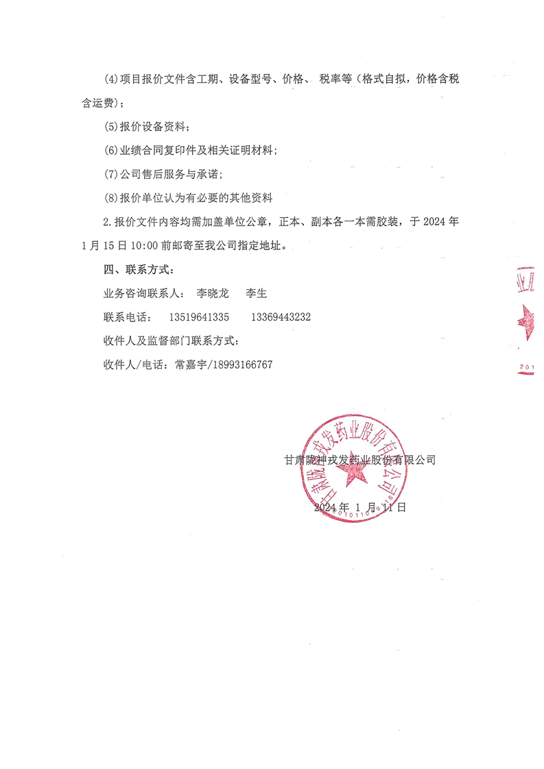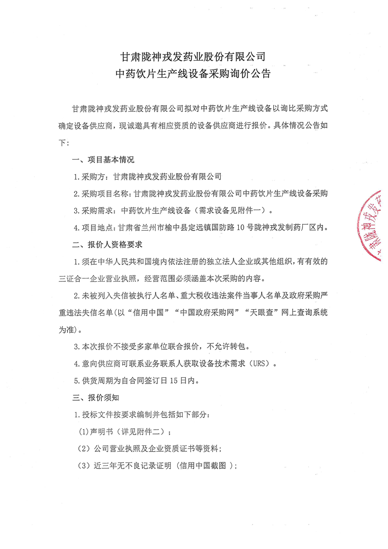 甘肅隴神戎發(fā)藥業(yè)股份有限公司中藥飲片生產(chǎn)線設(shè)備采購(gòu)詢價(jià)公告