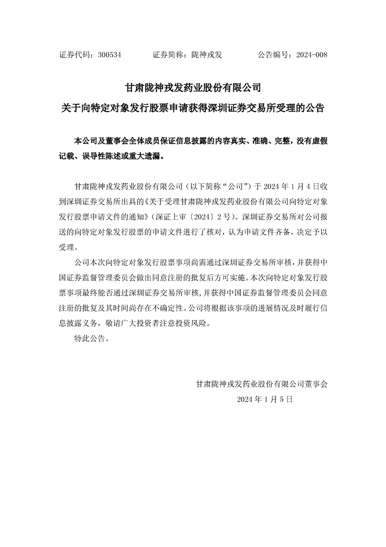 關(guān)于向特定對象發(fā)行股票申請獲得深圳證券交易所受理的公告