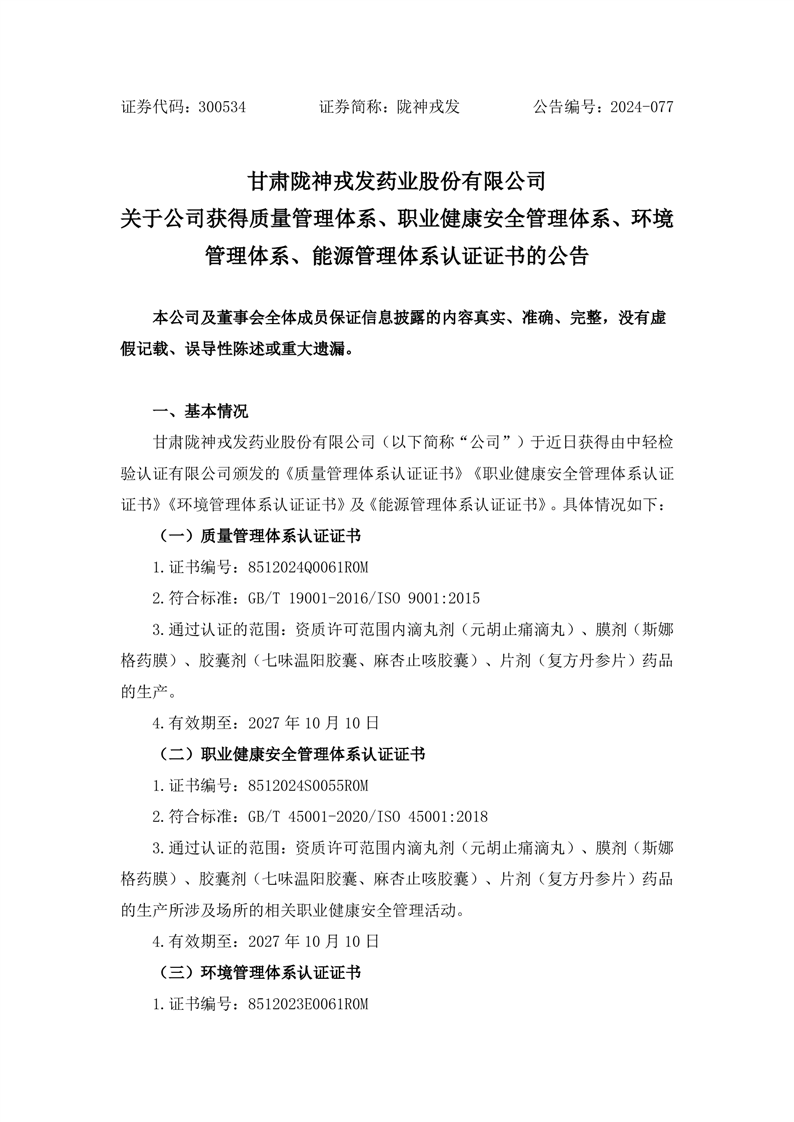 關(guān)于公司獲得質(zhì)量管理體系、職業(yè)健康安全管理體系、環(huán)境管理體系、能源管理體系認(rèn)證證書的公告