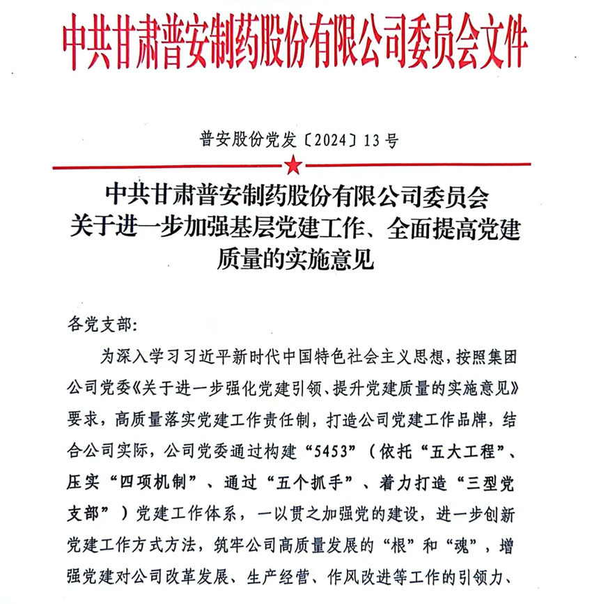 2024年,甘肅普安制藥股份有限公司黨委在甘肅藥業(yè)集團黨委的正確領(lǐng)導(dǎo)下,堅持黨建引領(lǐng),以“深耕細作挖潛能,降本增效做貢獻”為主線,錨定“黨建引領(lǐng)+節(jié)能降耗”的目標(biāo),扎實推進黨建與主業(yè)深度融合,切實將黨建優(yōu)勢轉(zhuǎn)化為發(fā)展優(yōu)勢。