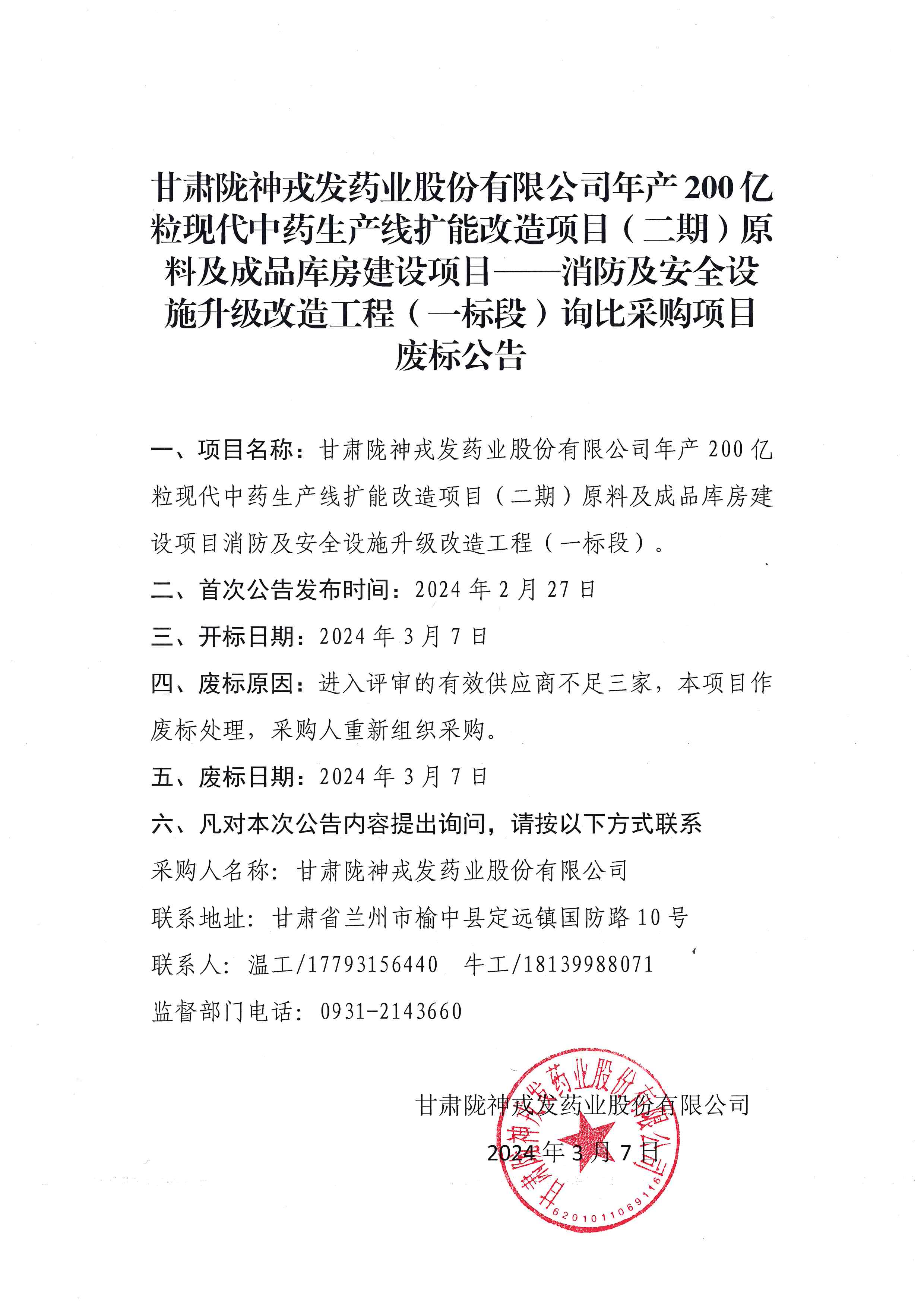 甘肅隴神戎發(fā)藥業(yè)股份有限公司年產(chǎn)200億粒現(xiàn)代中藥生產(chǎn)線擴能改造項目(二期)原料及成品庫房建設項目--消防及安全設施升級改造工程(一標段)詢比采購項目廢標公告