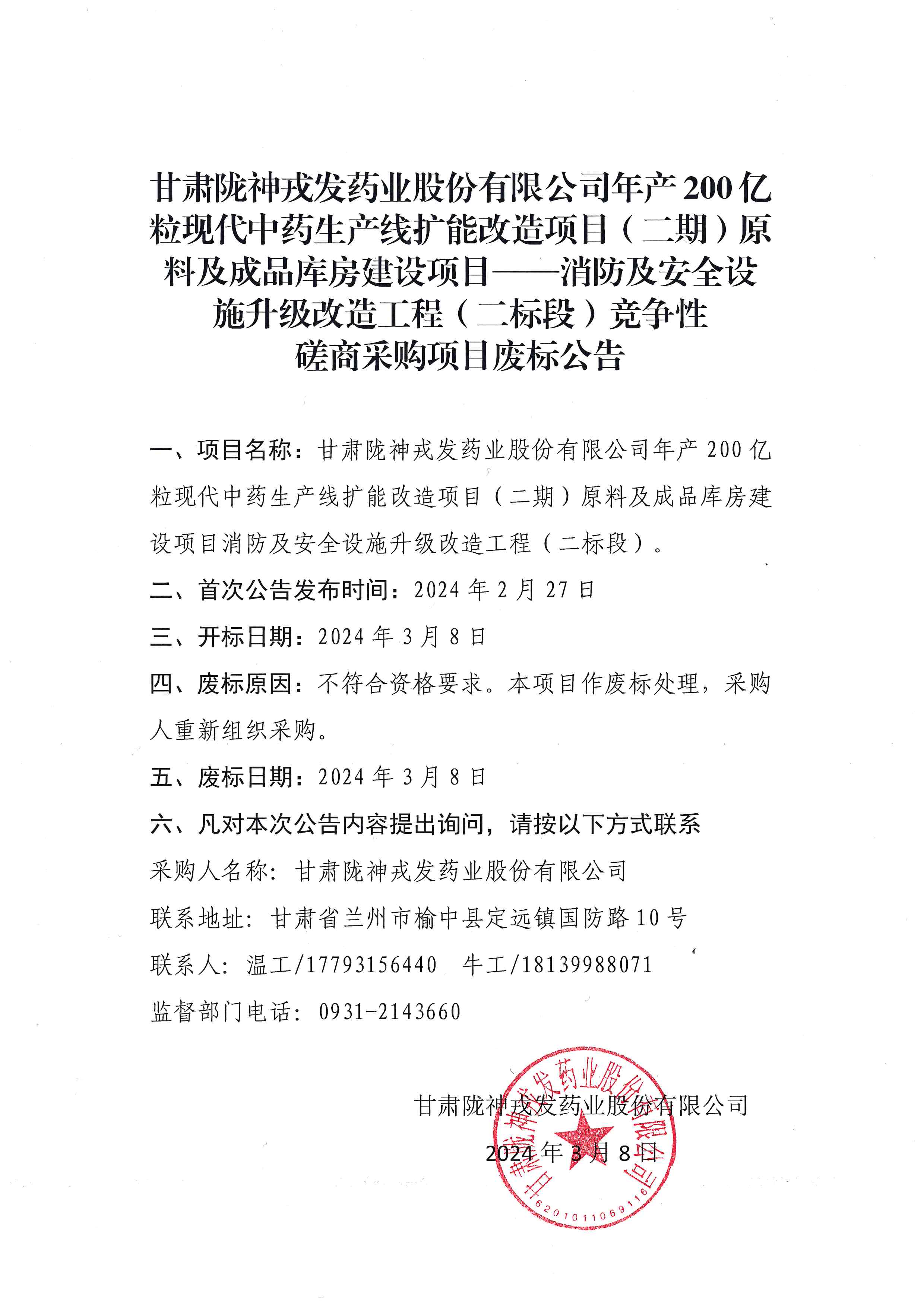 甘肅隴神戎發(fā)藥業(yè)股份有限公司年產(chǎn)200億,F(xiàn)代中藥生產(chǎn)線擴能改造項目(二期)原料及成品庫房建設(shè)項目--消防及安全設(shè)施升級改造工程(二標段)競爭性磋商采購項目廢標公告