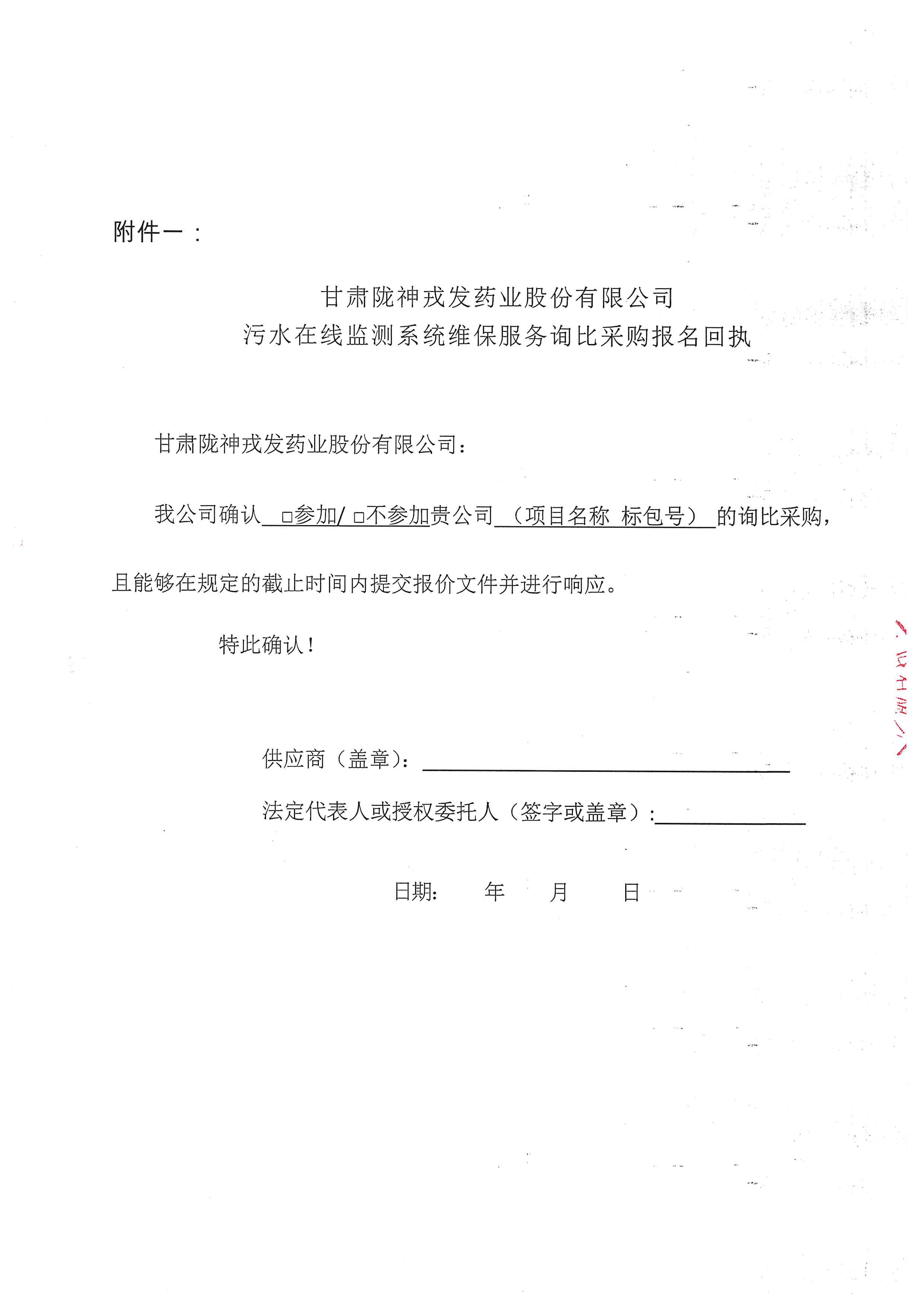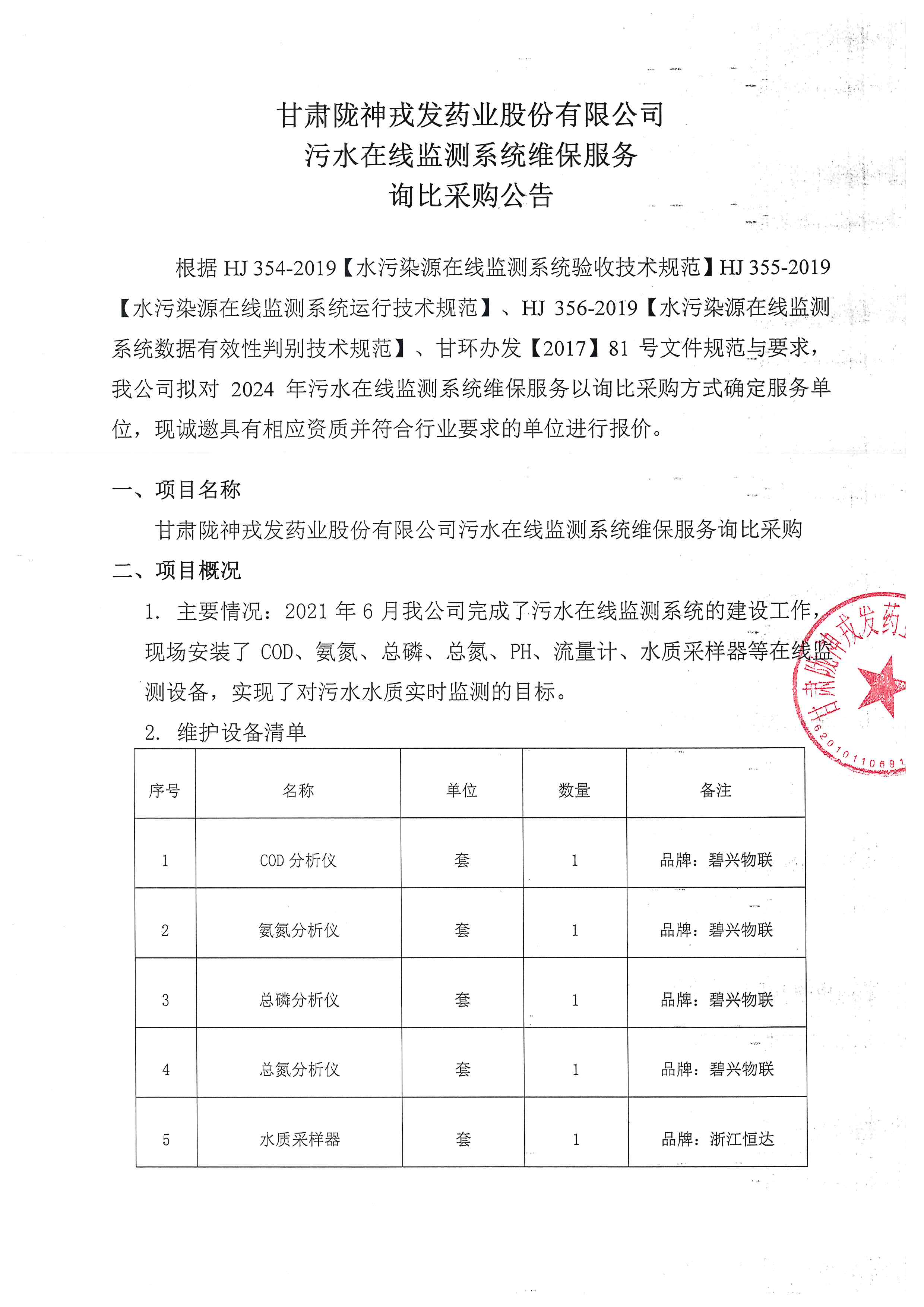 甘肅隴神戎發(fā)藥業(yè)股份有限公司污水在線監(jiān)測系統(tǒng)維保服務詢比采購公告