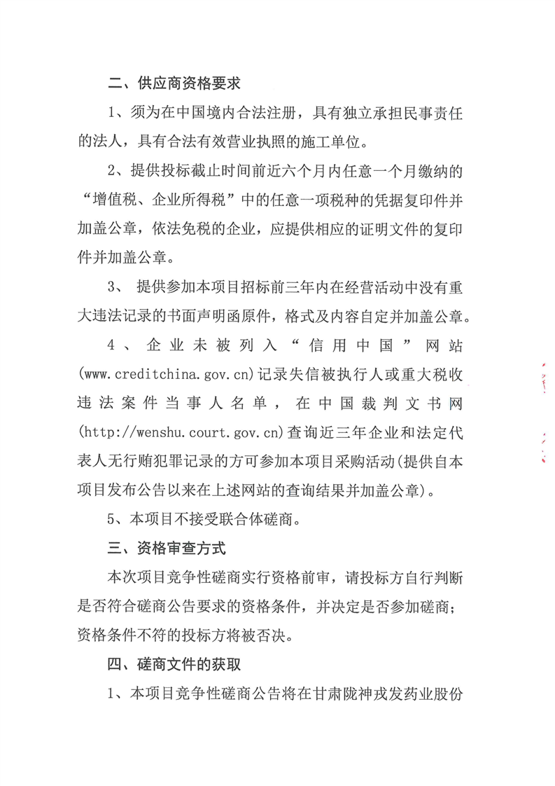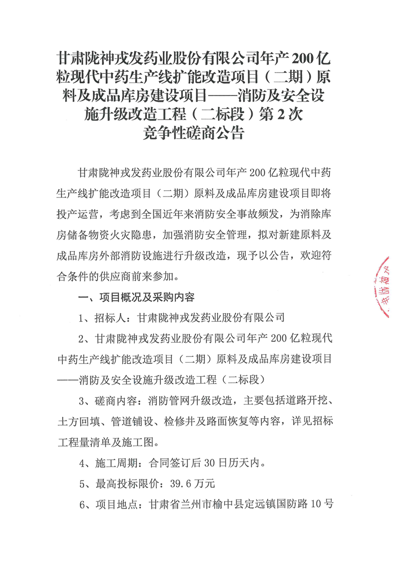 甘肅隴神戎發(fā)藥業(yè)股份有限公司年產(chǎn)200億粒現(xiàn)代中藥生產(chǎn)線擴能改造項目(二期)原料及成品庫房建設項目——消防及安全設施升級改造工程(二標段)第2次