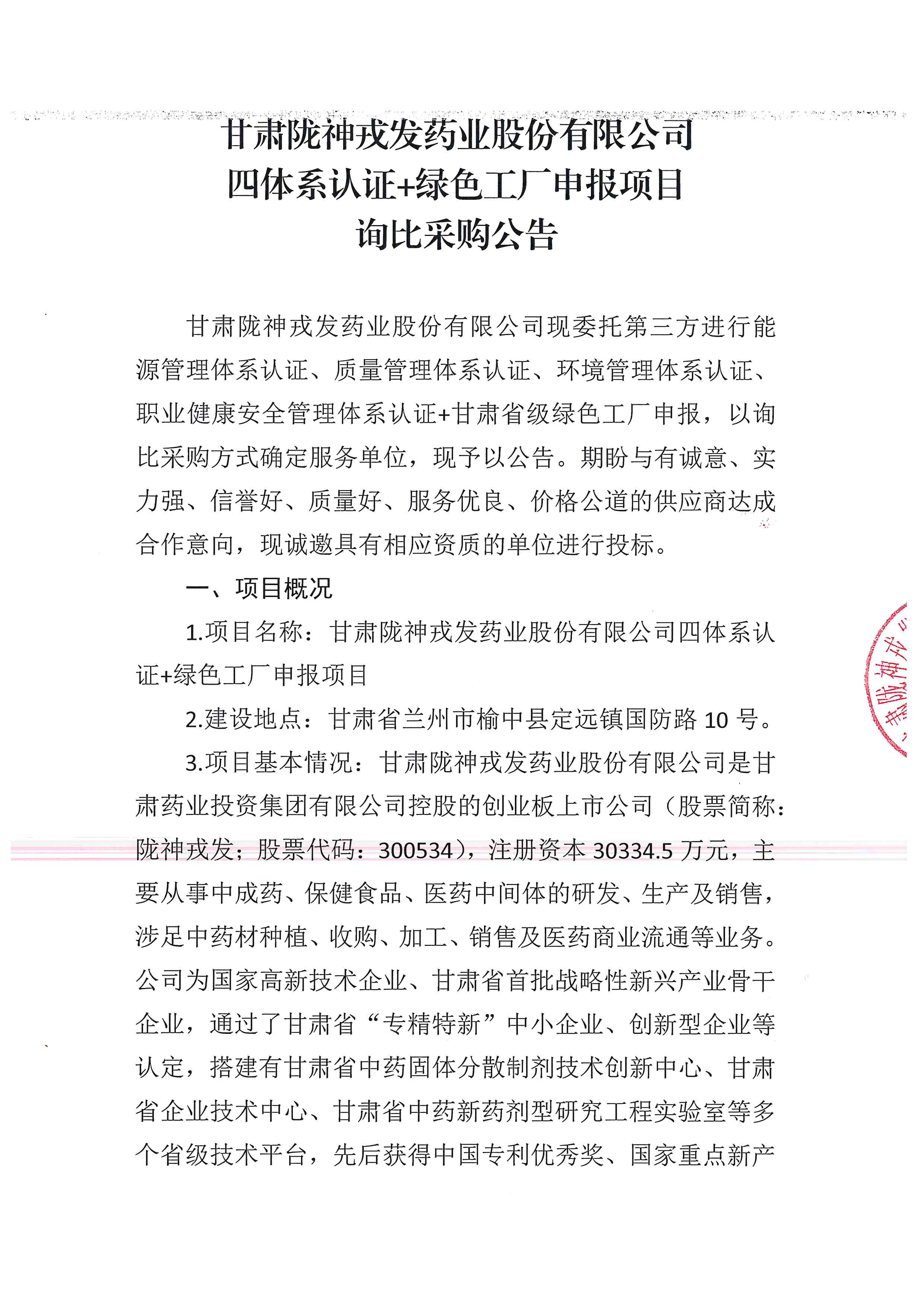 甘肅隴神戎發(fā)藥業(yè)股份有限公司四體系認(rèn)證+綠色工廠申報(bào)項(xiàng)目詢比采購公告
