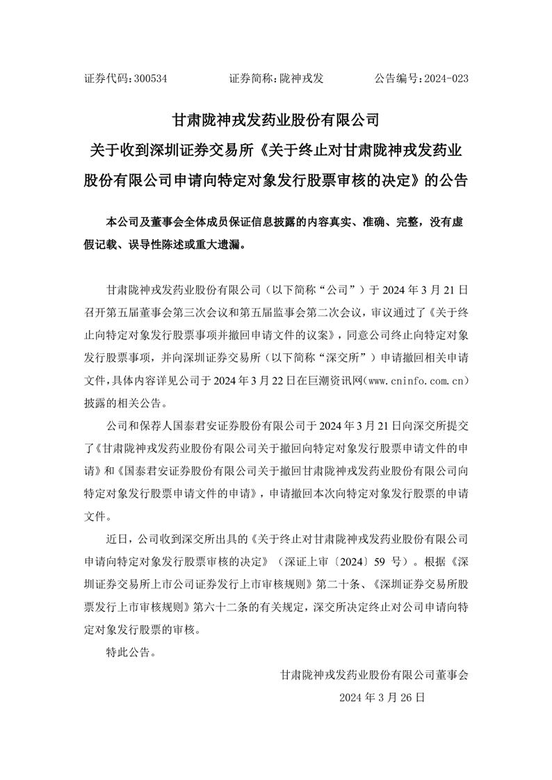 關于收到深圳證券交易所《關于終止對甘肅隴神戎發(fā)藥業(yè)股份有限公司申請向特定對象發(fā)行股票審核的決定》的公告