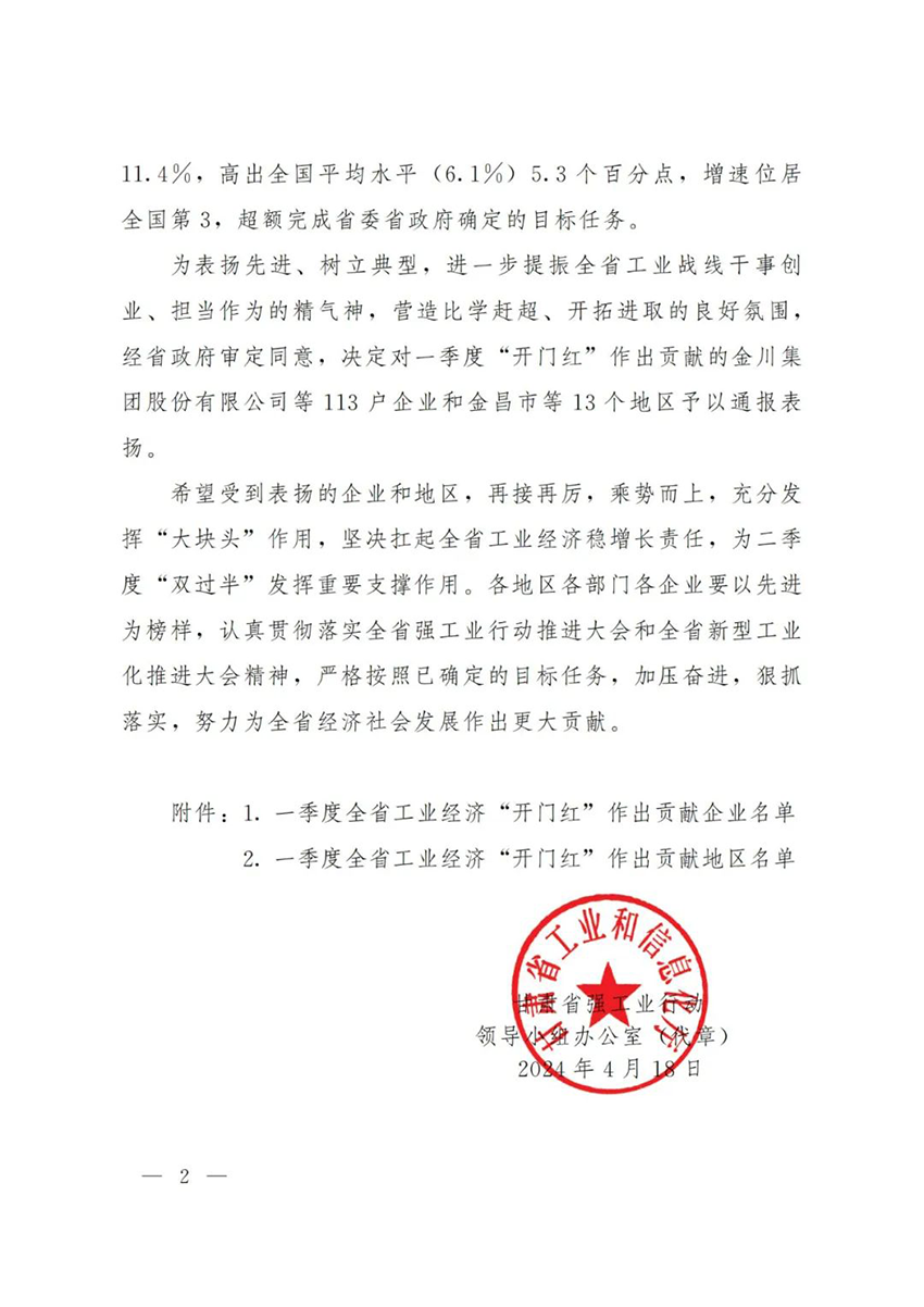 根據(jù)《甘肅省強工業(yè)行動領導小組辦公室關于表揚2024年一季度全省工業(yè)經濟“開門紅”作出突出貢獻企業(yè)和地區(qū)的通報》(甘工信發(fā)〔2024〕96號),甘肅藥業(yè)集團及子公司普安制藥被省工信廳評為2024年一季度全省工業(yè)經濟“開門紅”作出貢獻企業(yè)并給于通報表揚。