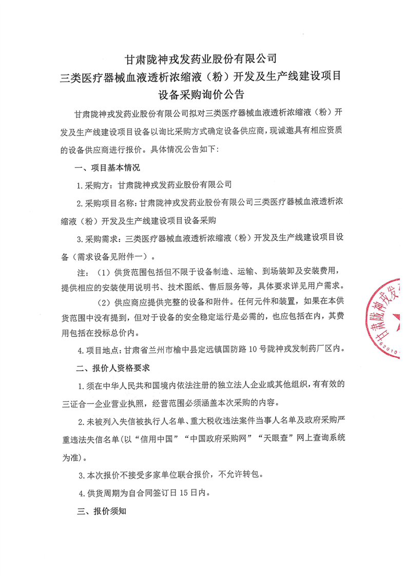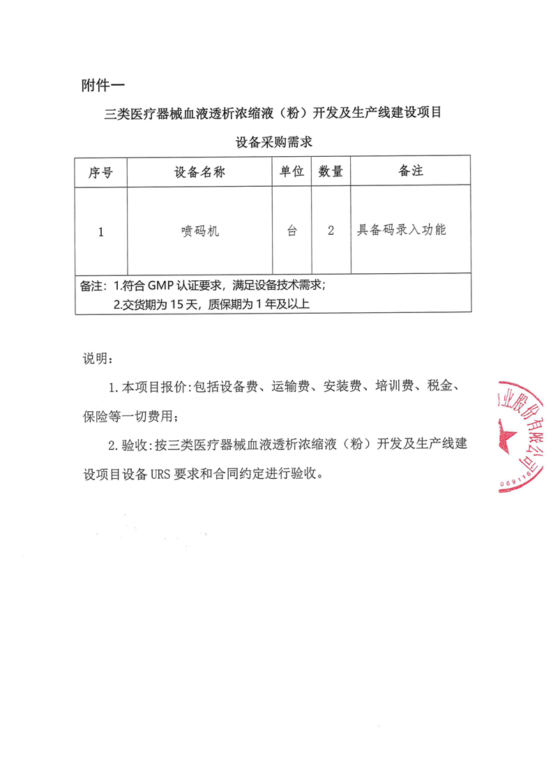 甘肅隴神戎發(fā)藥業(yè)股份有限公司三類醫(yī)療器械血液透析濃縮液(粉)開發(fā)及生產(chǎn)線建設(shè)項目設(shè)備采購詢價公告(噴碼機)