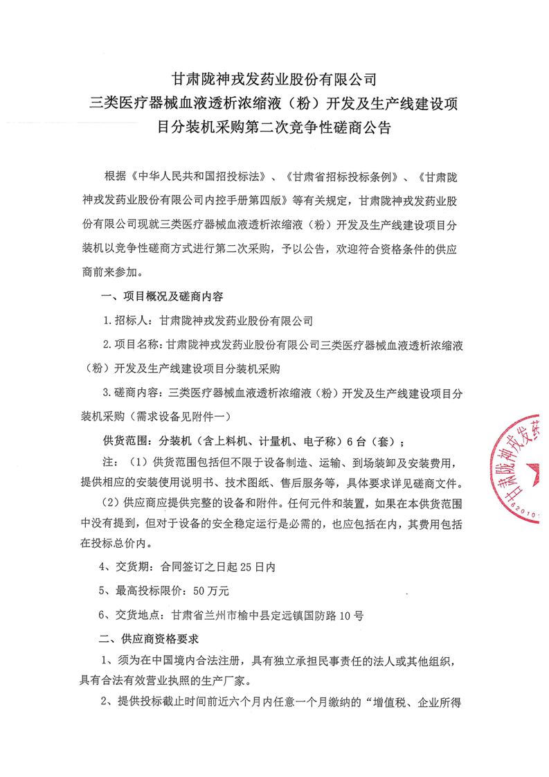 甘肅隴神戎發(fā)藥業(yè)股份有限公司三類醫(yī)療器械血液透析濃縮液(粉)開發(fā)及生產線建設項目分裝機采購第二次競爭性磋商公告