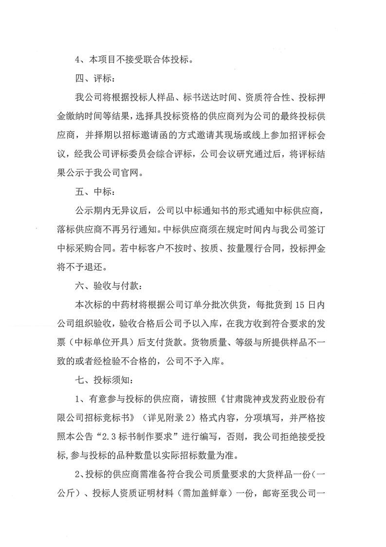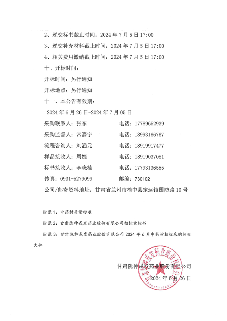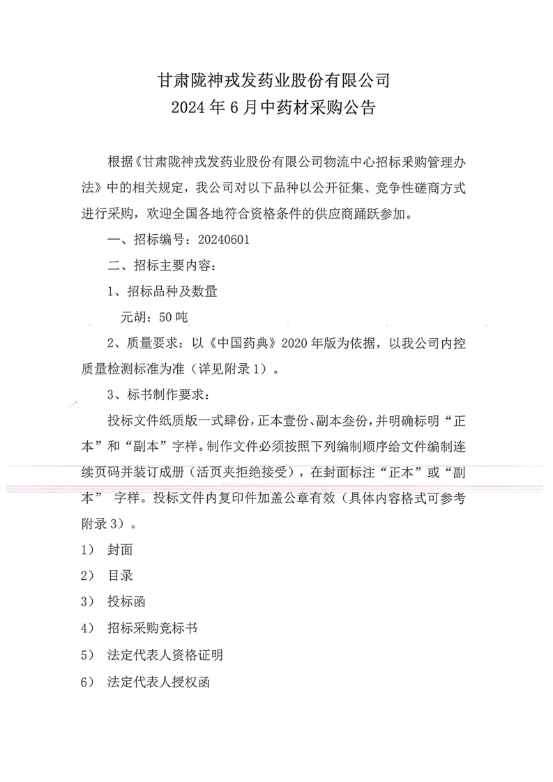 甘肅隴神戎發(fā)藥業(yè)股份有限公司2024年6月中藥材采購公告