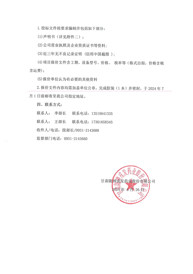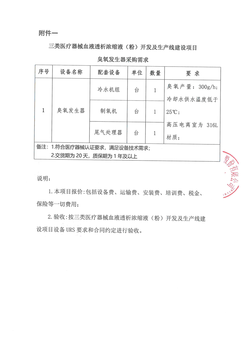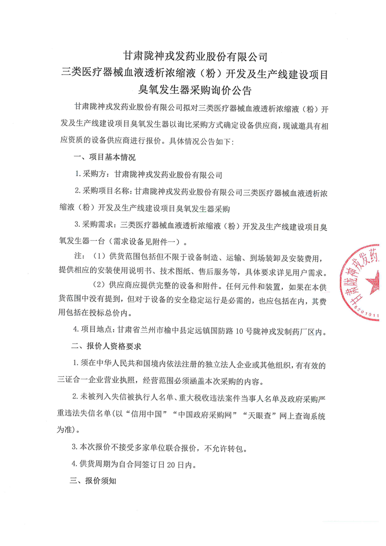 甘肅隴神戎發(fā)藥業(yè)股份有限公司三類(lèi)醫(yī)療器械血液透析濃縮液(粉)開(kāi)發(fā)及生產(chǎn)線建設(shè)項(xiàng)目臭氧發(fā)生器采購(gòu)詢價(jià)公告