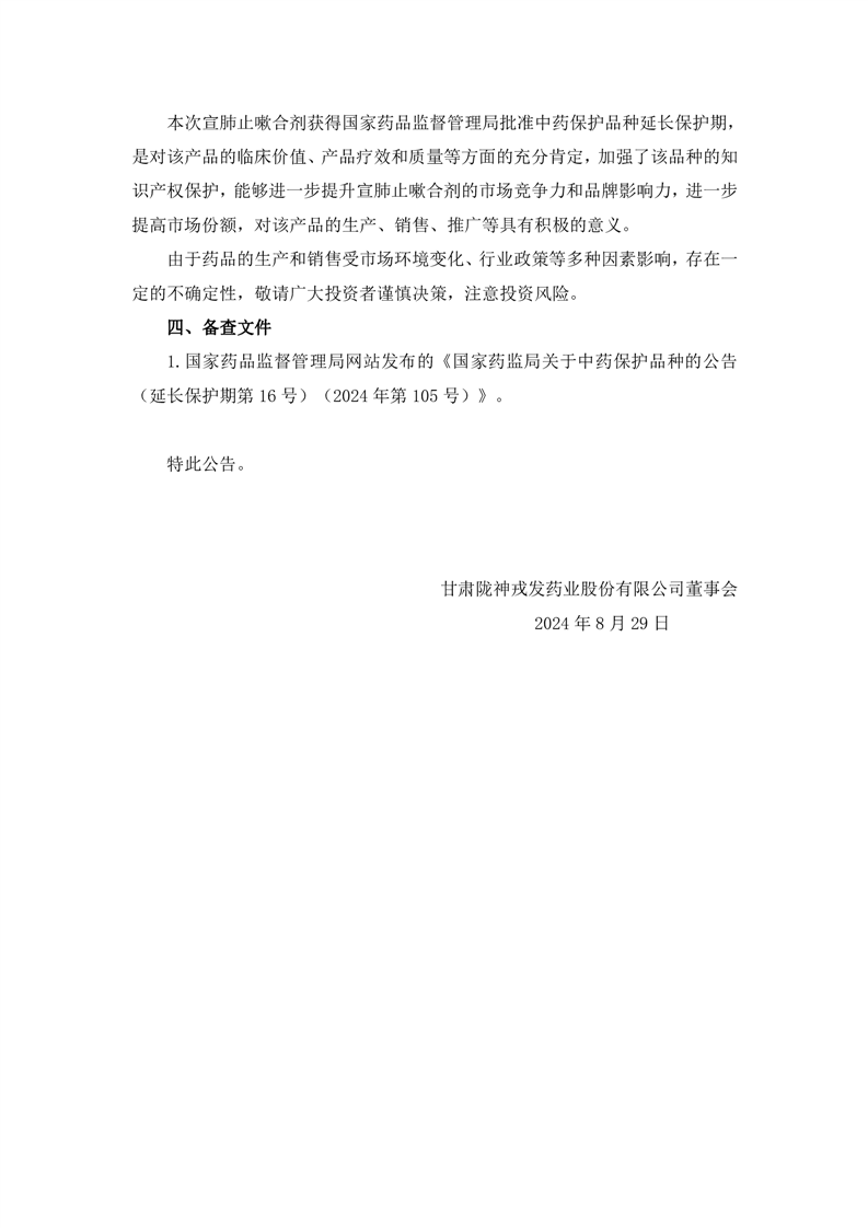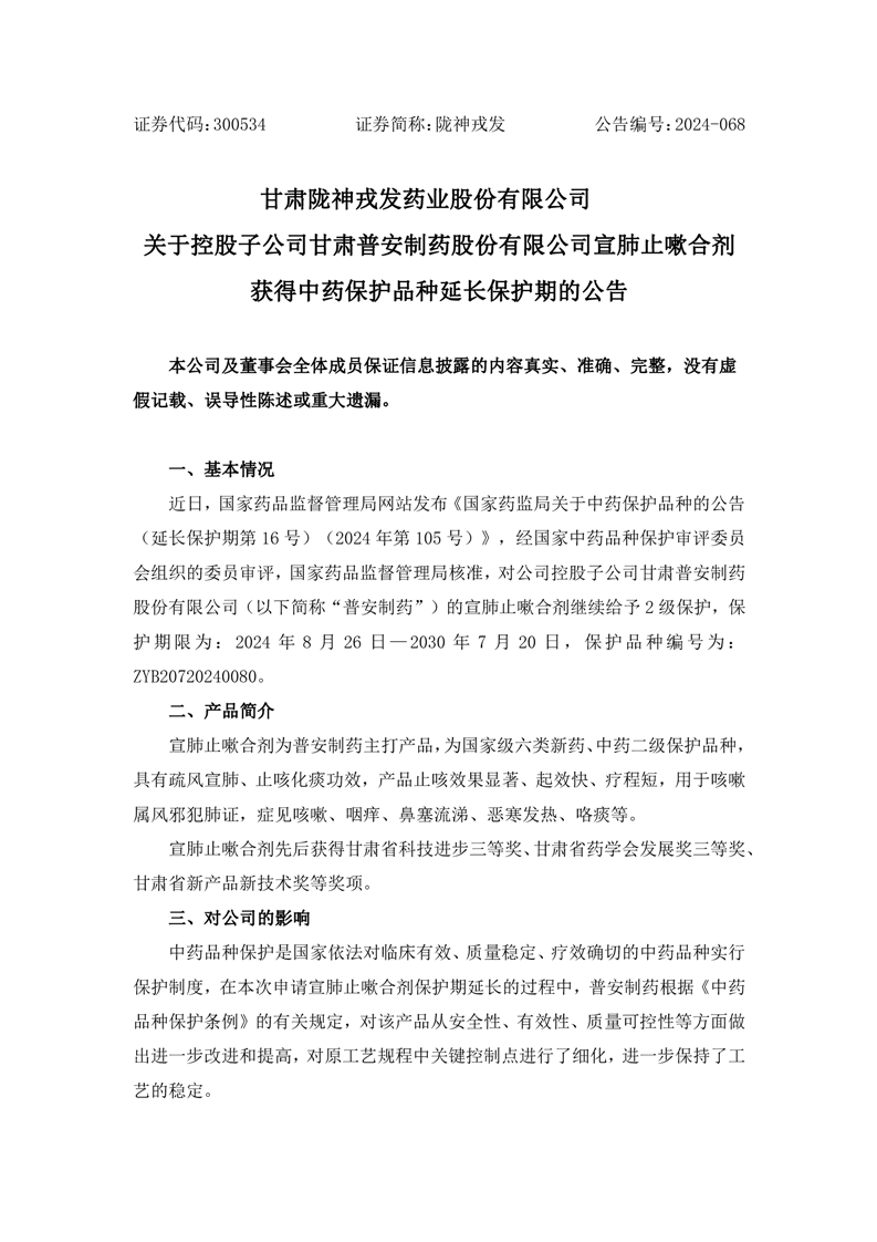 關(guān)于控股子公司甘肅普安制藥股份有限公司宣肺止嗽合劑獲得中藥保護(hù)品種延長(zhǎng)保護(hù)期的公告