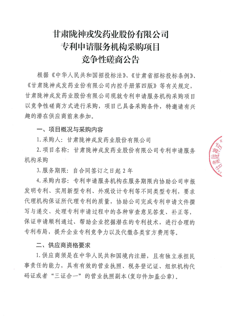 甘肅隴神戎發(fā)藥業(yè)股份有限公司專利申請服務(wù)機(jī)構(gòu)采購項(xiàng)目競爭性磋商公告