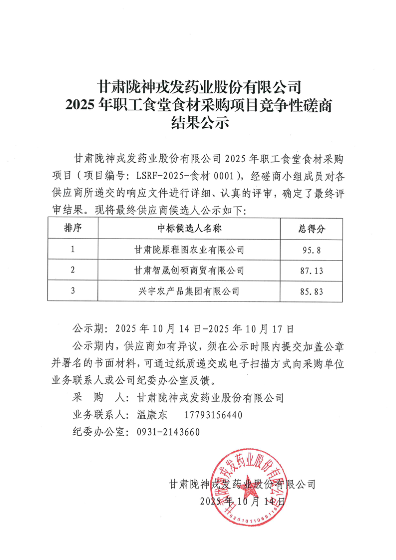 甘肅隴神戎發(fā)藥業(yè)股份有限公司2025年職工食堂食材采購項目競爭性磋商結果公示