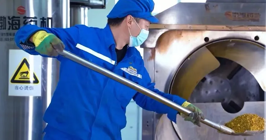 前處理提取車間揀選間,面前攤開的破碎的藥材需經(jīng)揀選,揀選出非藥用品部位及雜質(zhì)。前處理后藥材是后續(xù)提取的基礎(chǔ),一點(diǎn)雜質(zhì)都不能留。為提升效率,車間按“一人一崗、分區(qū)負(fù)責(zé)”的模式排班,單日可完成近4噸破碎藥材的處理工作。在炒藥間,兩臺(tái)炒藥機(jī)正勻速轉(zhuǎn)動(dòng),醋延胡索講究,醋潤(rùn)透心、炒至微黃,炒好的醋延胡索色澤均勻、香氣醇厚。