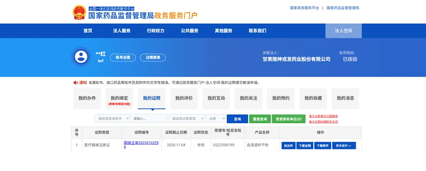 2025年11月5日,甘肅隴神戎發(fā)藥業(yè)股份有限公司申請注冊的第三類醫(yī)療器械“血液透析干粉”正式通過國家藥監(jiān)局醫(yī)療器械技術(shù)審評中心評審,并同步收到國家藥監(jiān)局下發(fā)的《中華人民共和國醫(yī)療器械注冊證》,證書編號為:國械注準(zhǔn)20253102294,證書有效期為2025年11月5日-2030年11月4日。