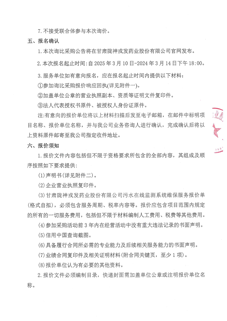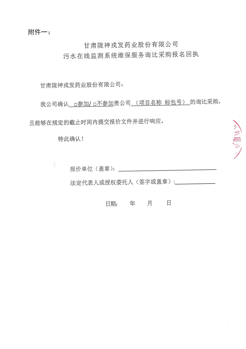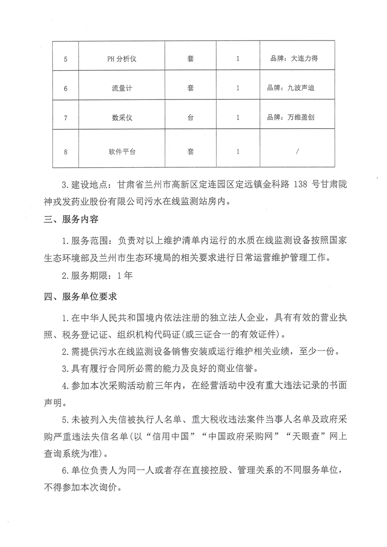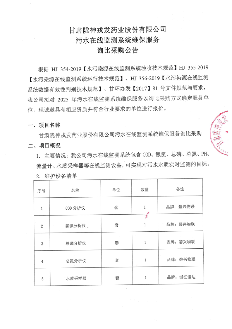 甘肅隴神戎發(fā)藥業(yè)股份有限公司污水在線監(jiān)測(cè)系統(tǒng)維保服務(wù)詢比采購公告