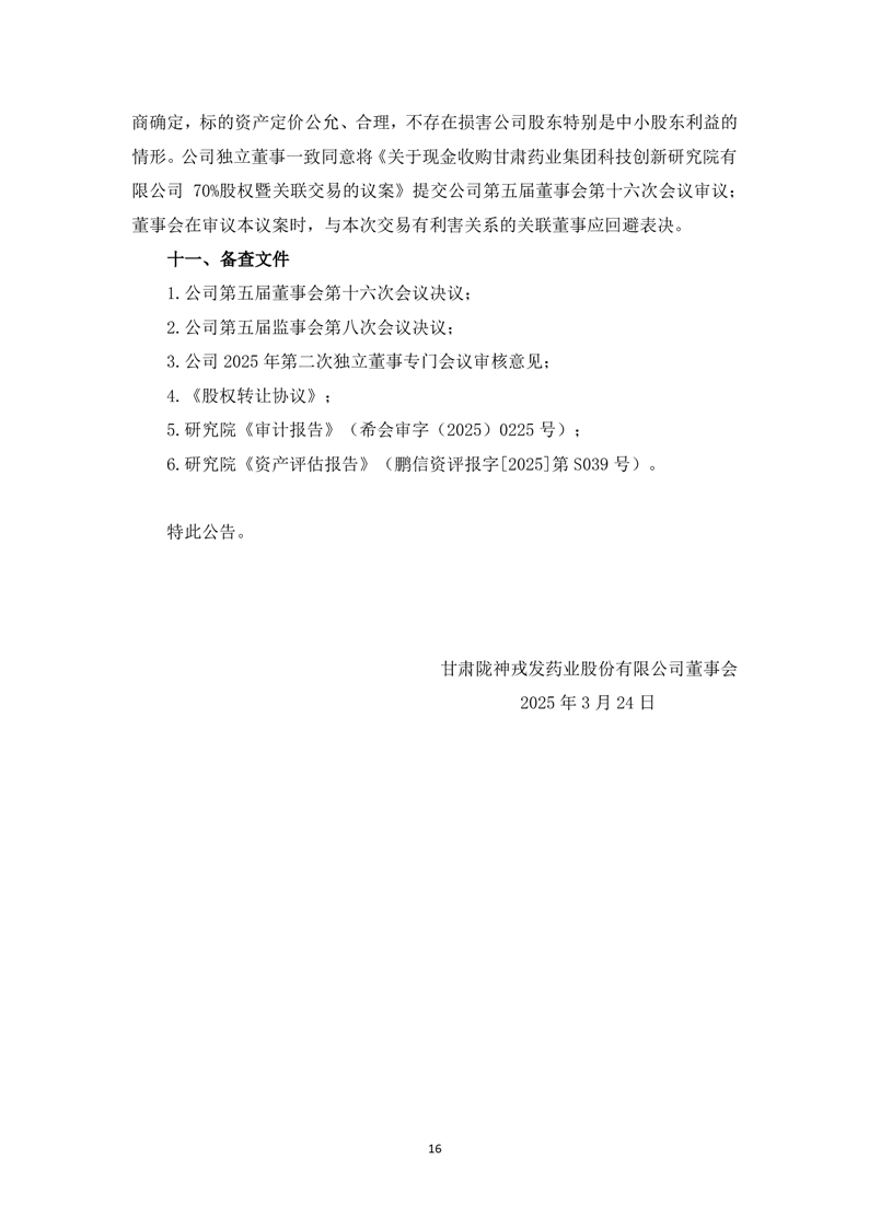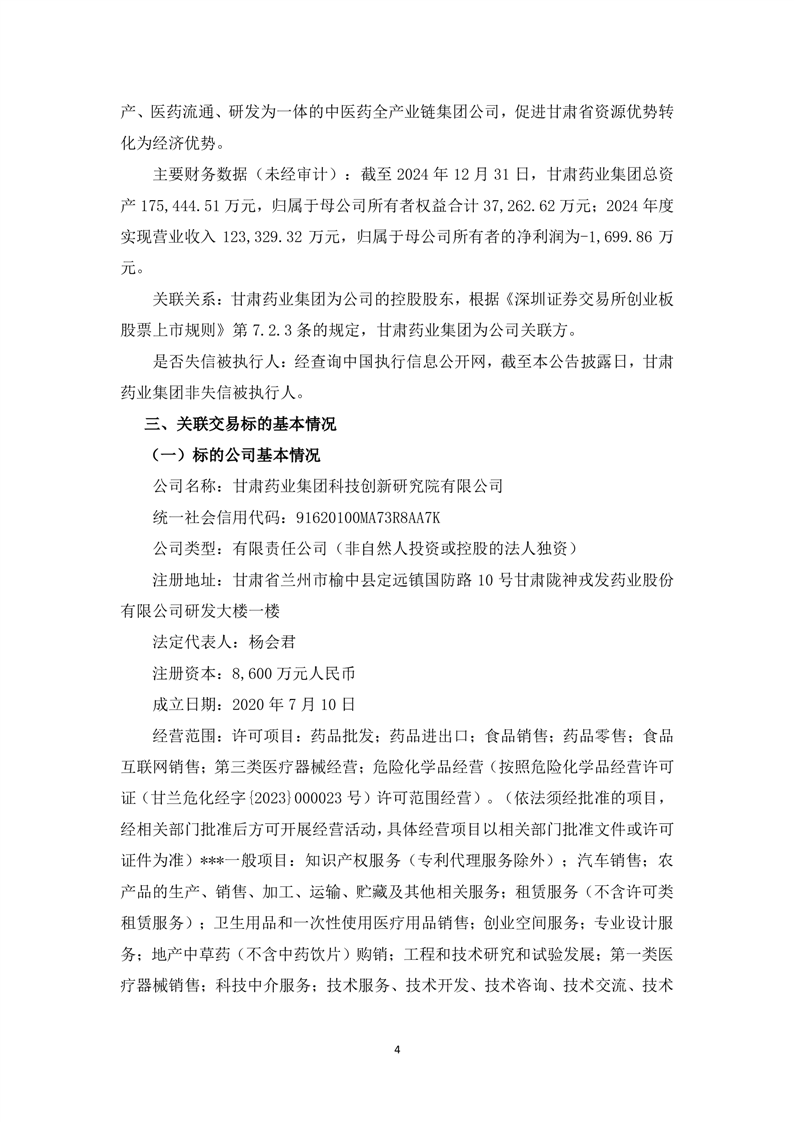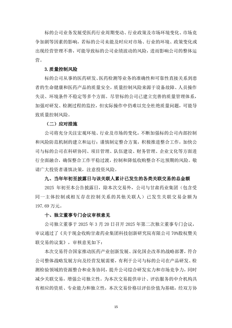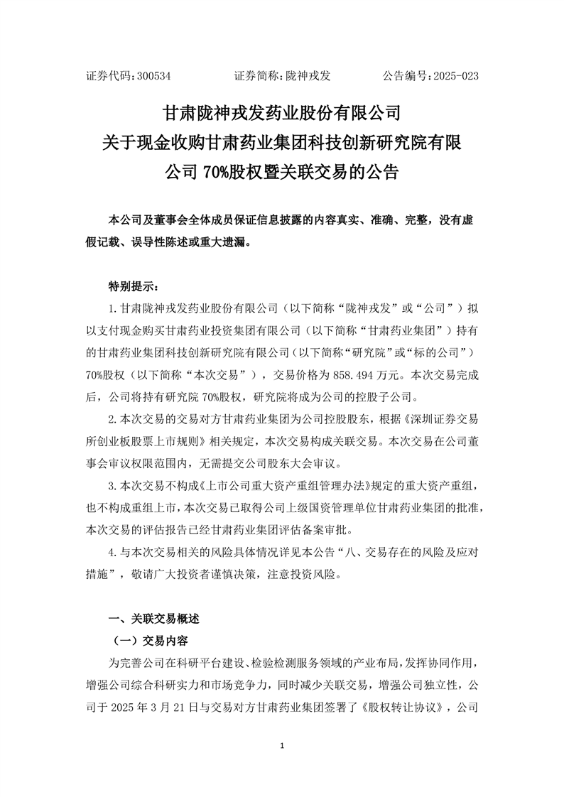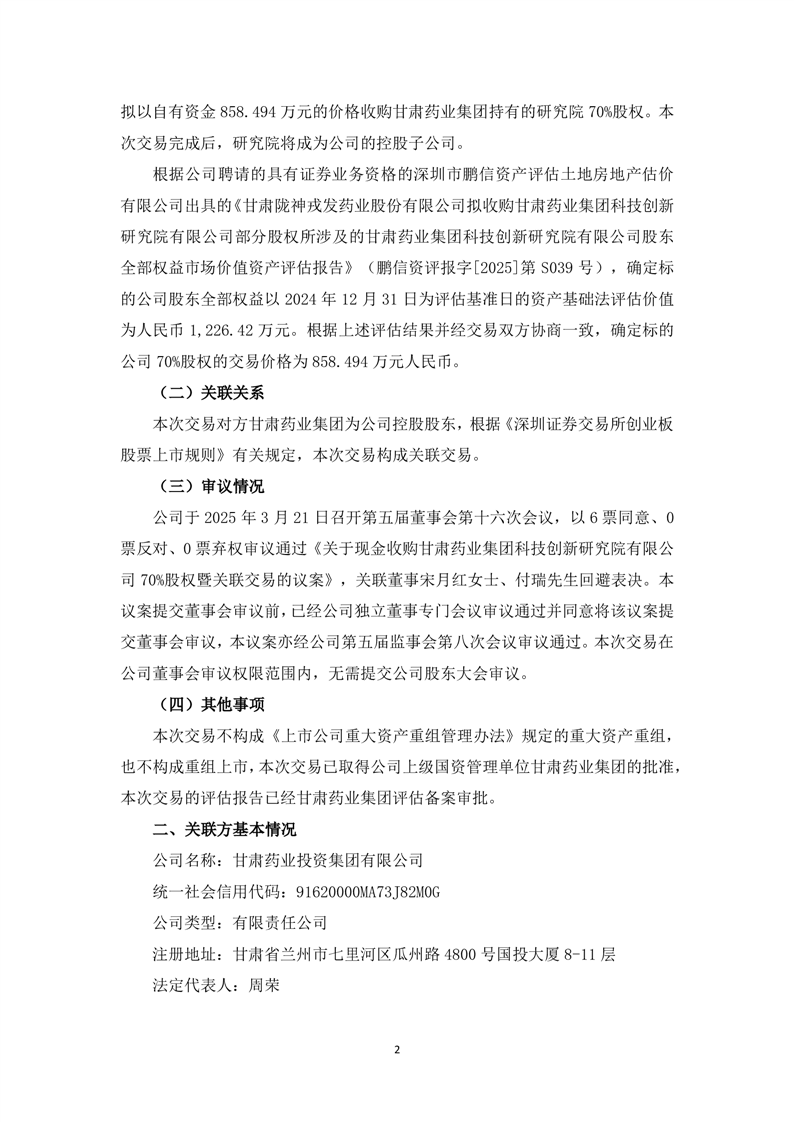 關于現金收購甘肅藥業(yè)集團科技創(chuàng)新研究院有限公司70%股權暨關聯交易的公告