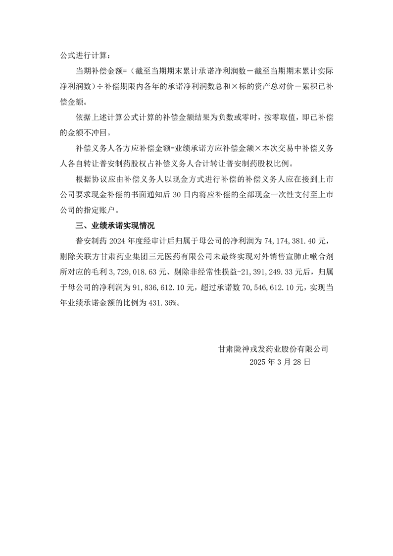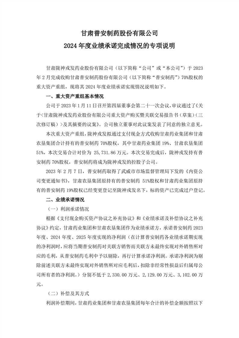 甘肅普安制藥股份有限公司2024年度業(yè)績(jī)承諾完成情況的專項(xiàng)說(shuō)明